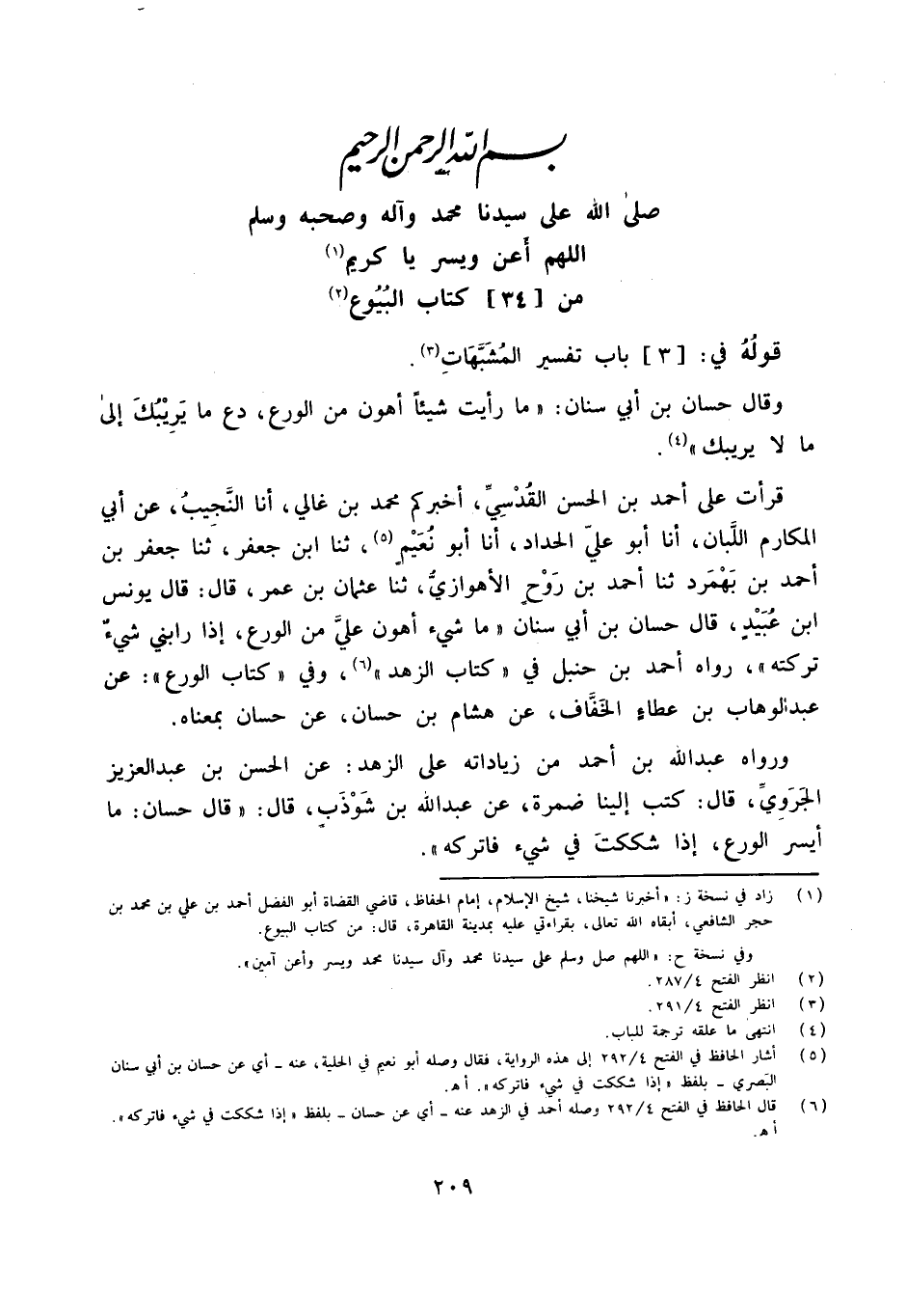 قَرَأت عَلَى أَحْمَدَ بْنِ الْحَسَنِ الْقُدسِي أخْبركُم مُحَمَّد بن غالي أَنا النجيب عَن أبي المكارم اللبان أَنا أَبُو عَليّ الْحداد أَنا أَبُو نعيم ثَنَا ابْن جَعْفَر ثَنَا جَعْفَر بن أَحْمد بن بهمرد ثَنَا أَحْمد بن روح الْأَهْوَازِي ثَنَا عُثْمَان بن عمر قَالَ قَالَ يُونُس ابْن عبيد قَالَ حسان بن أبي سِنَان مَا شَيْء أَهْون عَليّ من الْوَرع إِذا رَابَنِي شَيْء تركته رَوَاهُ أَحْمد بن حَنْبَل فِي كتاب الزّهْد وَفِي كتاب الْوَرع عَن عبد الْوَهَّاب بن عَطاء الْخفاف عَن هِشَام بن حسان عَن حسان بِمَعْنَاهُ