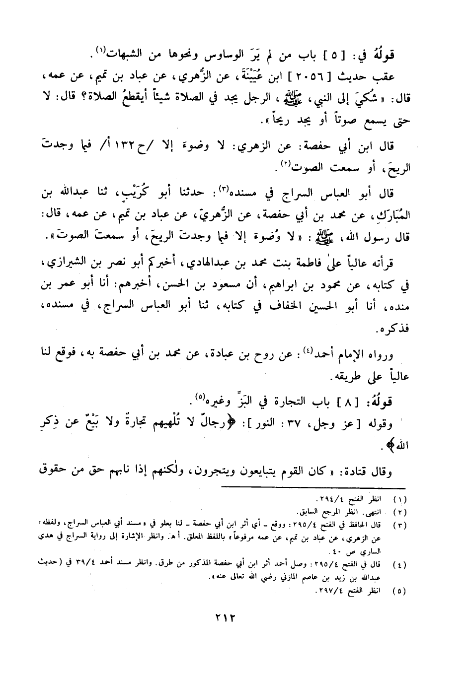 عَقِبَ حَدِيثِ 2056 ابْنِ عُيَيْنَةَ عَنِ الزُّهْرِيِّ عَنْ عَبَّادِ بْنِ تَمِيمٍ عَنْ عَمِّهِ قَالَ شُكِيَ إِلَى النَّبِي صلى الله عَلَيْهِ وَسلم الرَّجُلُ يَجِدُ فِي الصَّلاةِ شَيْئًا أَيَقْطَعُ الصَّلاةَ قَالَ لَا حَتَّى يَسْمَعَ صَوْتًا أَوْ يَجِدَ رِيحًا