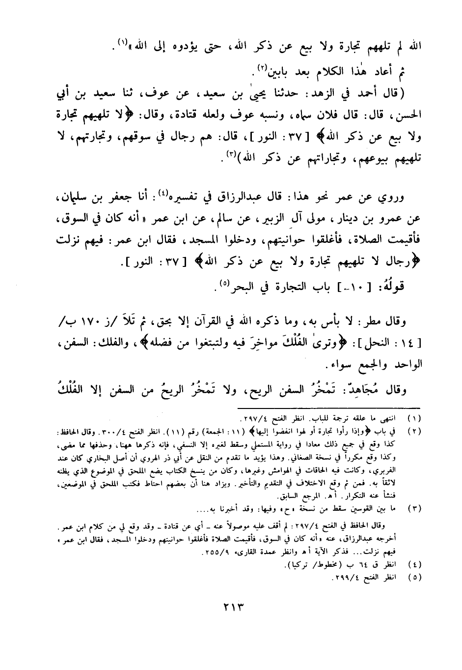 قَالَ أَحْمد فِي الزّهْد حَدثنَا يحيى بن سعيد عَن عَوْف ثَنَا سعيد بن أبي الْحسن قَالَ قَالَ فلَان سَمَّاهُ وَنسبه عَوْف وَلَعَلَّه قَتَادَة وَقَالَ {لَا تُلْهِيهِمْ تِجَارَةٌ وَلا بَيْعٌ عَنْ ذِكْرِ اللَّهِ} 37 النُّور قَالَ هم رجال فِي سوقهم وتجارتهم لَا تُلْهِيهِمْ بيوعهم وتجاراتهم عَن ذكر الله