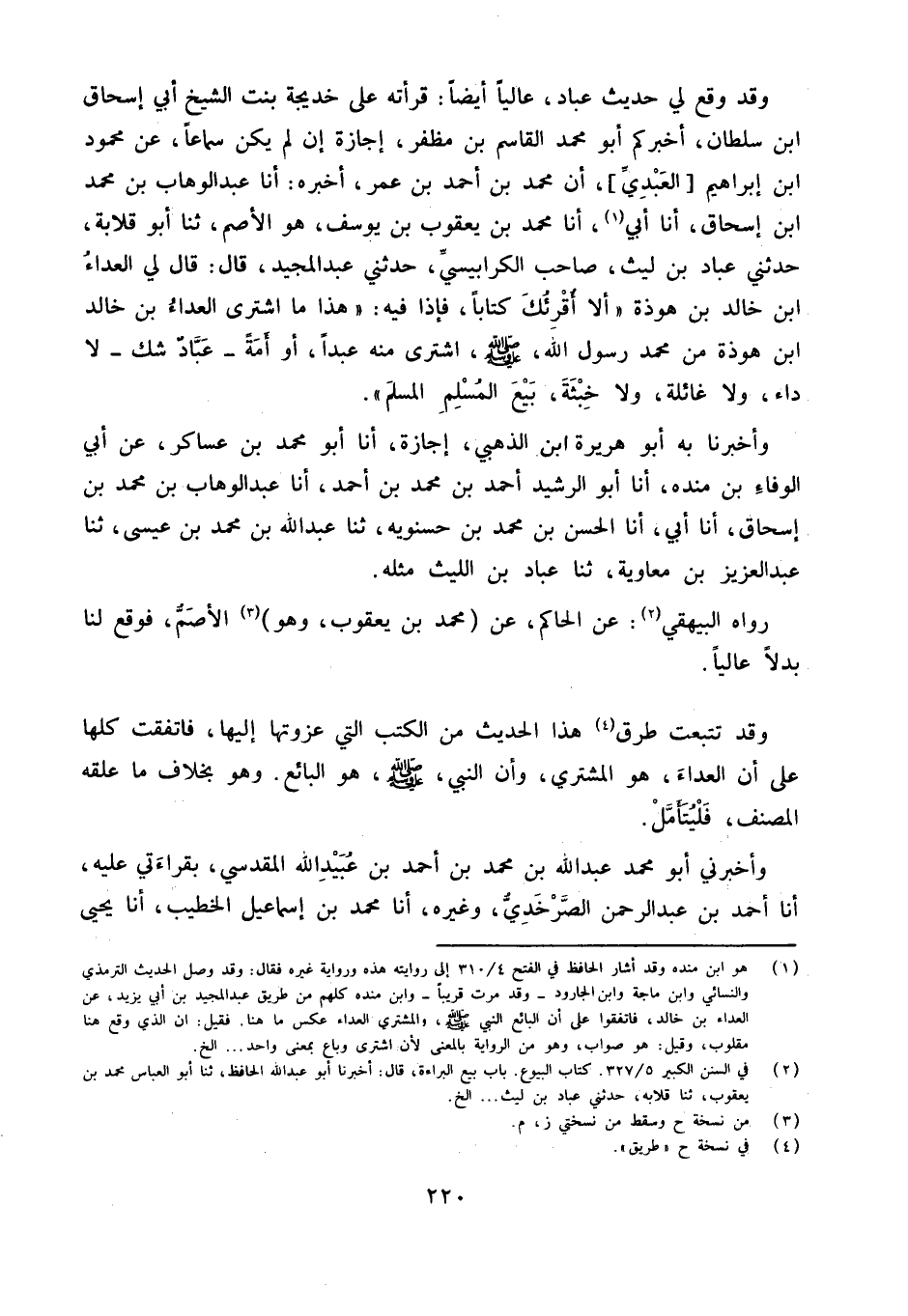وَقد وَقع لي حَدِيث عباد عَالِيا أَيْضا قرأته على خَدِيجَة بنت الشَّيْخ أبي إِسْحَاق بن سُلْطَان أَخْبَرَكُمْ أَبُو مُحَمَّدٍ الْقَاسِمُ بن مظفر إجَازَة إِن لم يكن سَمَاعا عَن مَحْمُود بن إِبْرَاهِيمَ الْعَبْدِيِّ أَنَّ مُحَمَّدَ بْنَ أَحْمَدَ بْنِ عُمَرَ أَخْبَرَهُ أَنا عبد الْوَهَّاب بن مُحَمَّد بن إِسْحَاق أَنا أبي أَنا مُحَمَّد بْنُ يَعْقُوبَ بْنِ يُوسُفَ هُوَ الأَصَمُّ ثَنَا أَبُو قِلابَةَ حَدَّثَنِي عباد بن لَيْث صَاحب الْكَرَابِيسِي حَدَّثَنِي عَبْدُ الْمَجِيدِ قَالَ قَالَ لِي الْعَدَّاءُ بْنُ خَالِدِ بْنِ هَوْذَةَ أَلا أُقْرِئُكَ كِتَابًا فَإِذَا فِيهِ هَذَا مَا اشْتَرَى الْعَدَّاءُ بْنُ خَالِدِ بْنِ هَوْذَةَ مِنْ مُحَمَّد رَسُول الله صلى الله عَلَيْهِ وَسَّلَمَ اشْتَرَى مِنْهُ عَبْدًا أَوْ أَمَةً عَبَّادٌ شَكَّ لَا دَاءَ وَلا غَائِلَةَ وَلا خِبْثَةَ بَيْعَ الْمُسْلِمِ الْمُسْلِمَ