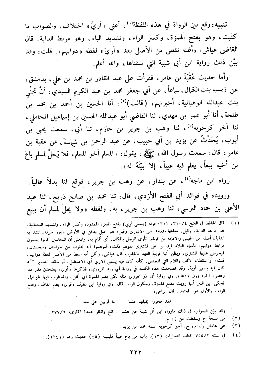 وَأما حَدِيث عقبَة بن عَامر فَقَرَأت على عبد الْقَادِر بن مُحَمَّد بن عَليّ بِدِمَشْق عَنْ زَيْنَبَ بِنْتِ الْكَمَالِ سَمَاعًا عَنْ أَبِي جَعْفَرٍ مُحَمَّدِ بْنِ عَبْدِ الْكَرِيمِ السَّيِّدِيِّ أَنَّ تَجَنِّي بِنْتَ عَبْدِ اللَّهِ الْوَهْبَانِيَّةَ أَخْبَرَتْهُمْ قَالَتْ أَنا الْحُسَيْنُ بْنُ أَحْمَدَ ابْن مُحَمَّدِ بْنِ طَلْحَةَ أَنا أَبُو عُمَرَ بْنُ مَهْدِيٍّ ثَنَا الْقَاضِي أَبُو عبد الله الْحُسَيْن ابْن إِسْمَاعِيل الْمحَامِلِي ثَنَا أَخُو كرخويه ثَنَا وَهْبُ بْنُ جَرِيرِ بْنِ حَازِمٍ ثَنَا أَبِي سَمِعت يَحْيَى بْنُ أَيُّوبَ يُحَدِّثُ عَنْ يَزِيدَ بن أبي حبيب عَن عبد الرَّحْمَنِ بْنِ شِمَاسَةَ عَنْ عُقْبَةَ بْنِ عَامِرٍ قَالَ سَمِعت رَسُولَ الله صلى الله عَلَيْهِ وَسلم يَقُولُ الْمُسْلِمُ أَخُو الْمُسْلِمِ فَلا يَحِلُّ لِمُسْلِمٍ بَاعَ مِنْ أَخِيهِ بَيْعًا يَعْلَمُ فِيهِ عَيْبًا إِلا بَيَّنَهُ لَهُ