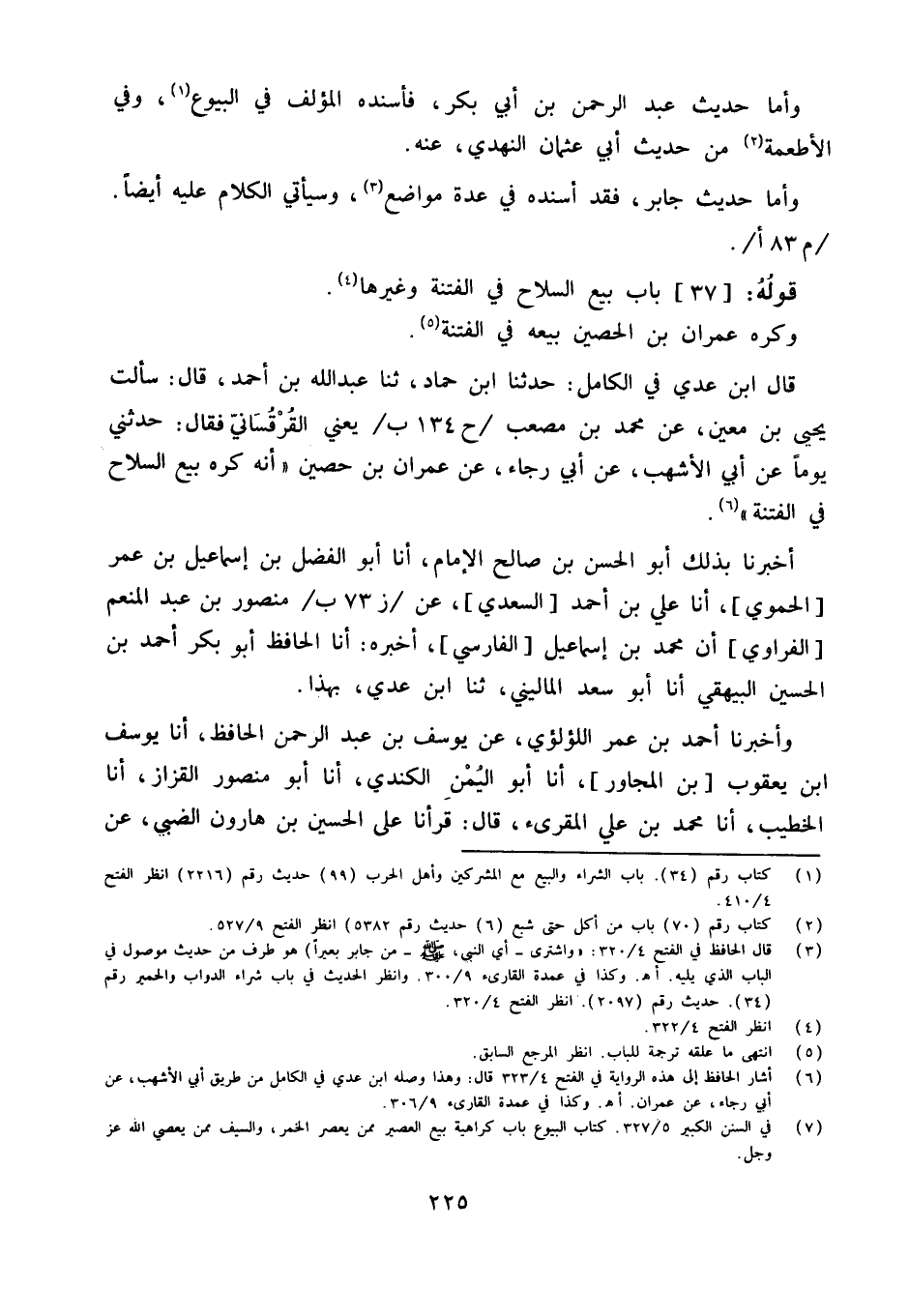 قَالَ ابْن عدي فِي الْكَامِل حَدثنَا ابْنُ حَمَّادٍ ثَنَا عَبْدُ اللَّهِ بْنُ أَحْمَدَ قَالَ سَأَلْتُ يَحْيَى بْنَ مَعِينٍ عَنْ مُحَمَّدِ بْنِ مُصْعَبٍ يَعْنِي الْقَرْقَسَانِيَّ فَقَالَ حَدَّثَنِي يَوْمًا عَنْ أَبِي الأَشْهَبِ عَنْ أَبِي رَجَاءٍ عَنْ عِمْرَانَ بْنِ حُصَيْنٍ أَنَّهُ كَرِهَ بَيْعَ السِّلاحِ فِي الْفِتْنَةِ