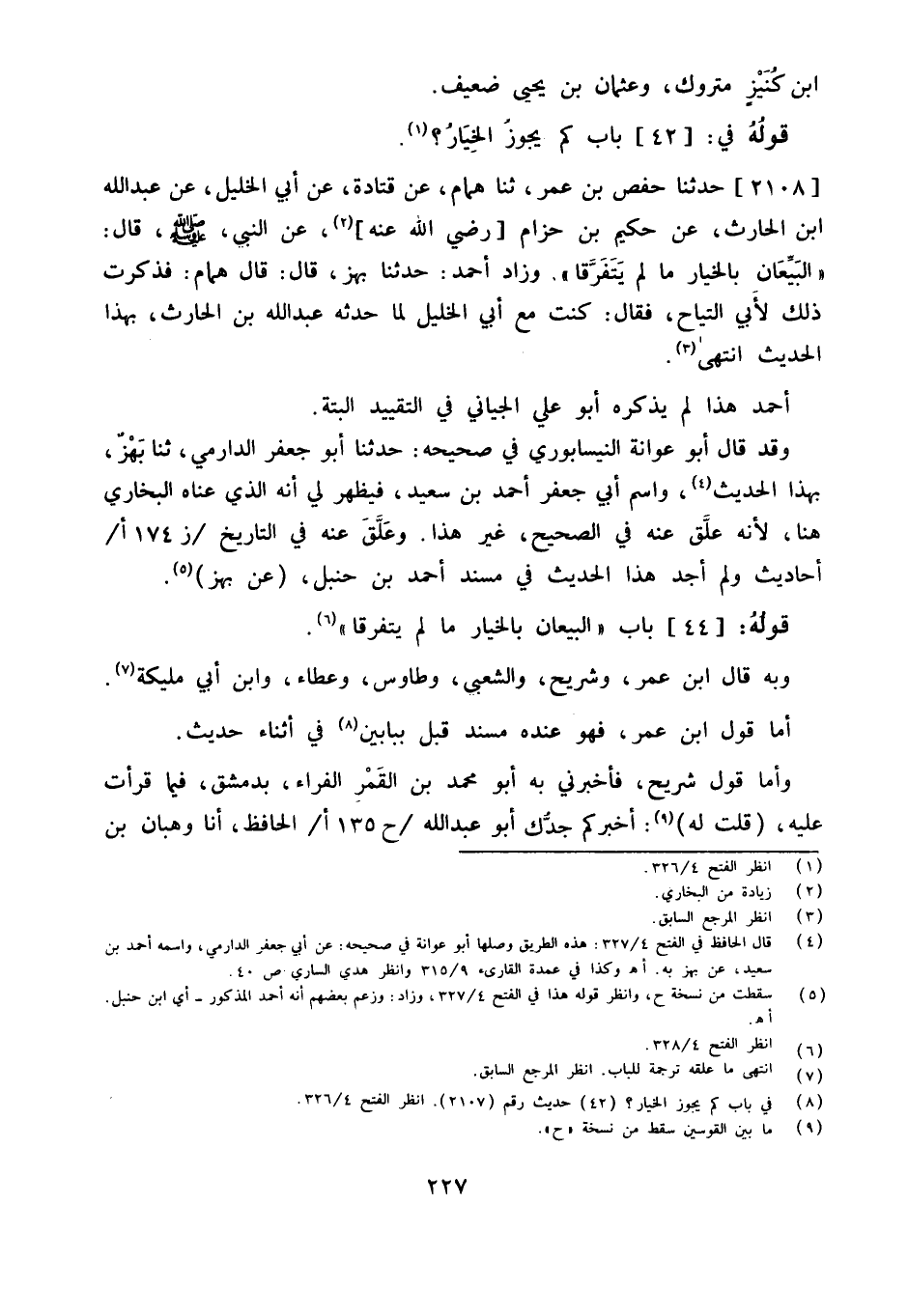 2108 - حَدثنَا حَفْصُ بْنُ عُمَرَ ثَنَا هَمَّامٌ عَنْ قَتَادَةَ عَنْ أَبِي الْخَلِيلِ عَنْ عبد الله بن الْحَارِث عَن حَكِيمِ بْنِ حِزَامٍ رَضِيَ اللَّهُ عَنْهُ عَنِ النَّبِيِّ صَلَّى اللَّهُ عَلَيْهِ وَسَلَّمَ قَالَ الْبَيِّعَانِ بِالْخِيَارِ مَا لَمْ يَتَفَرَّقَا وَزَادَ أَحْمَدُ حَدثنَا بهز قَالَ قَالَ همام فَذكرت ذَلِك لأبي التياح فَقَالَ كنت مَعَ أبي الْخَلِيل لما حَدثهُ عبد الله بن الْحَارِث بِهَذَا الحَدِيث انْتهى
