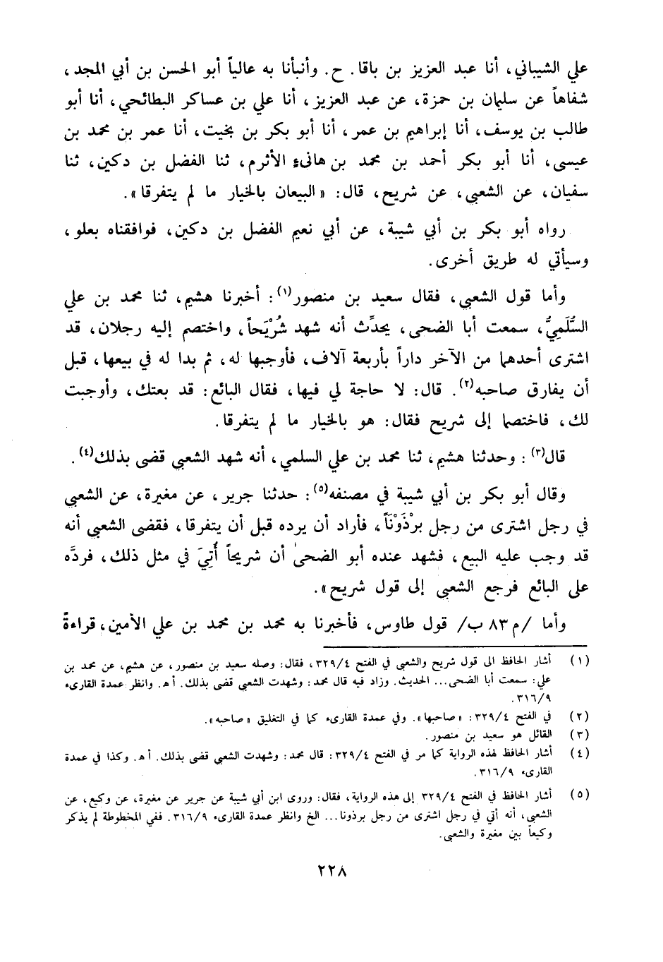 وَأما قَول الشّعبِيّ فَقَالَ سعيد بن مَنْصُور أخبرنَا هشيم ثَنَا مُحَمَّد بن عَليّ السّلمِيّ سَمِعت أَبَا الضُّحَى يحدث أَنه شهد شريحا واختصم إِلَيْهِ رجلَانِ قد اشْترى أَحدهمَا من الآخر دَارا بأَرْبعَة آلَاف فأوجبها لَهُ ثمَّ بدا لَهُ فِي بيعهَا قبل أَن يُفَارق صَاحبه قَالَ لَا حَاجَة لي فِيهَا فَقَالَ البَائِع قد بِعْتُك وأوجبت لَك فاختصما إِلَى شُرَيْح فَقَالَ هُوَ بِالْخِيَارِ مَا لم يَتَفَرَّقَا