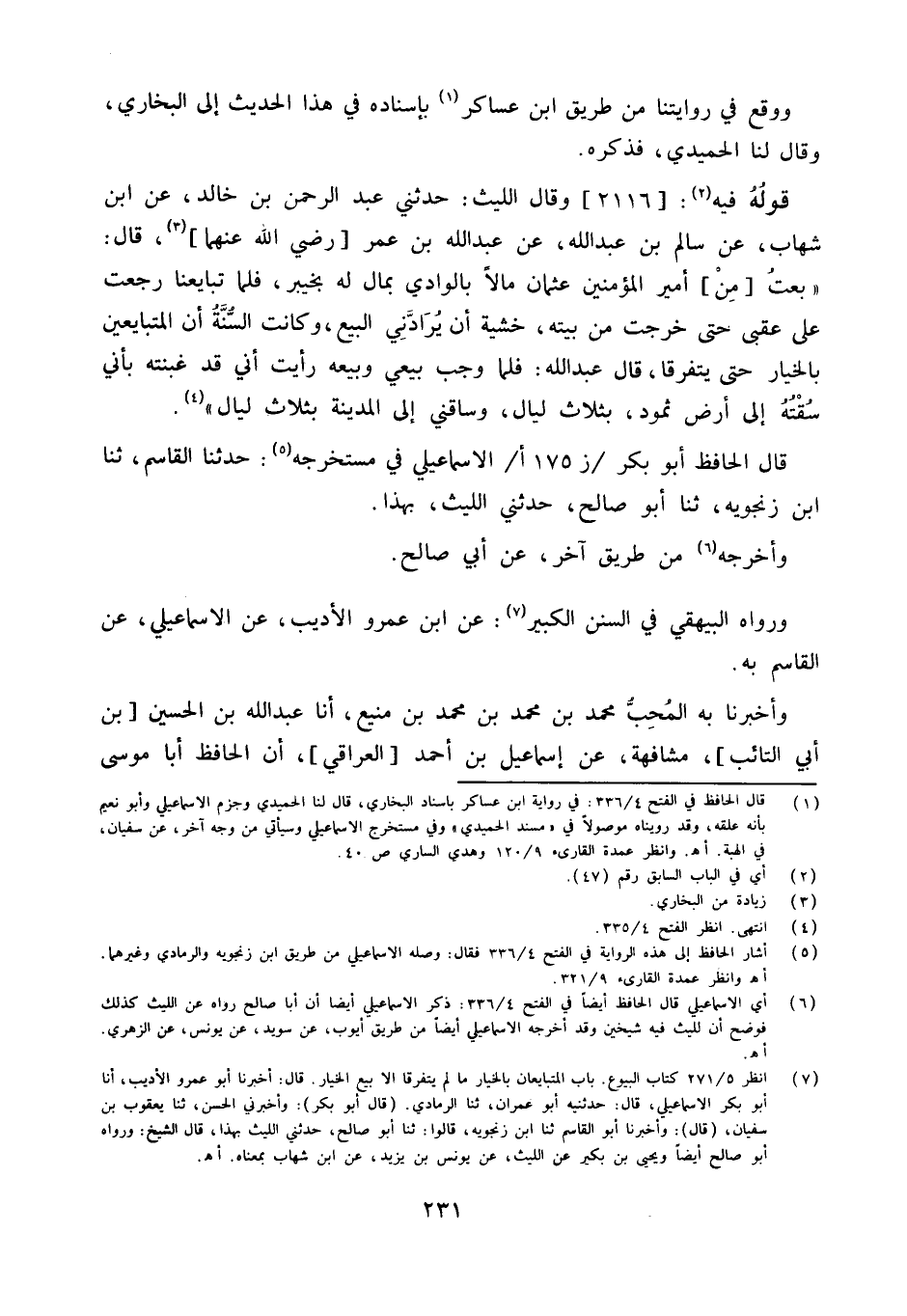 2116 - وَقَالَ اللَّيْثُ حَدَّثَنِي عَبْدُ الرَّحْمَنِ بْنُ خَالِدٍ عَنِ ابْنِ شِهَابٍ عَنْ سَالِمُ بْنُ عَبْدِ اللَّهِ عَنِ عبد الله بن عمر رَضِي اللَّهُ عَنْهُمَا قَالَ بِعْتُ مِنْ أَمِيرِ الْمُؤْمِنِينَ عُثْمَانَ مَالا بِالْوَادِي بِمَالٍ لَهُ بِخَيْبَرَ فَلَمَّا تَبَايَعْنَا رَجَعْتُ عَلَى عَقِبِي حَتَّى خَرَجْتُ مِنْ بَيْتِهِ خَشْيَةَ أَنْ يُرَادَّنِي الْبَيْعَ وَكَانَتِ السُّنَّةُ أَنَّ الْمُتَبَايِعَيْنِ بِالْخِيَارِ حَتَّى يَتَفَرَّقَا قَالَ عَبْدُ اللَّهِ فَلَمَّا وَجَبَ بَيْعِي وَبَيْعُهُ رَأَيْتُ أَنِّي قَدْ غَبَنْتُهُ بِأَنِّي سُقْتُهُ إِلَى أَرْضِ ثَمُودَ بِثَلاثِ لَيَالٍ وَسَاقَنِي إِلَى الْمَدِينَةِ بِثَلاثِ لَيَالٍ
