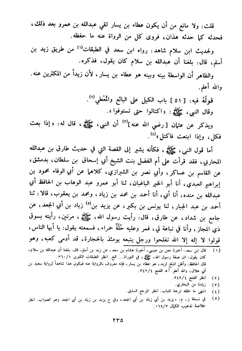 وَأما قَول النَّبِي صلى الله عَلَيْهِ وَسلم فَكَأَنَّهُ يُشِير إِلَى الْقِصَّة الَّتِي فِي حَدِيث طَارق بن عبد الله الْمحَاربي فقد قَرَأت على أم الْفضل بنت الشَّيْخ أبي إِسْحَاق بن سُلْطَان بِدِمَشْق عَنِ الْقَاسِمِ بْنِ عَسَاكِرَ وَأَبِي نَصْرِ بْنِ الشِّيرَازِيِّ كِلاهُمَا عَنْ أَبِي الْوَفَاء مَحْمُود بن إِبْرَاهِيم الْعَبْدي أَنا أَبُو الْخَيْرِ الْبَاغَبَانُ ثَنَا أَبُو عَمْرٍو عَبْدُ الْوَهَّابِ بْنُ الْحَافِظِ أَبِي عَبْدِ اللَّهِ بْنِ مَنْدَهْ أَنا أَبِي أَنا أَحْمَدُ بْنُ مُحَمَّدِ بْنِ زِيَادٍ وَمُحَمَّدُ بْنُ يَعْقُوبَ قَالا ثَنَا أَحْمَدُ بْنُ عَبْدِ الْجَبَّارِ ثَنَا يُونُسُ بْنُ بُكَيْرٍ عَنْ يَزِيدَ بْنِ زِيَادِ بْنِ أَبِي الْجَعْدِ عَنْ جَامِعِ بْنِ شَدَّادٍ عَنْ طَارِقٍ قَالَ رَأَيْتُ رَسُولَ اللَّهِ صَلَّى اللَّهُ عَلَيْهِ وَسَلَّمَ مَرَّتَيْنِ رَأَيْتُهُ بِسُوقِ ذِي الْمَجَازِ وَأنا فِي تَبَاعَةٍ لِي فَمَرَّ وَعَلَيْهِ حُلَّةٌ حَمْرَاءُ فَسَمِعْتُهُ يَقُولُ يَا أَيُّهَا النَّاسُ قُولُوا لَا إِلَهَ إِلا اللَّهُ تُفْلِحُوا وَرَجُلٌ يَتْبَعُهُ يَوْمَئِذٍ بِالْحِجَارَةِ قَدْ أَدْمَى كَعْبَهُ وَهُوَ