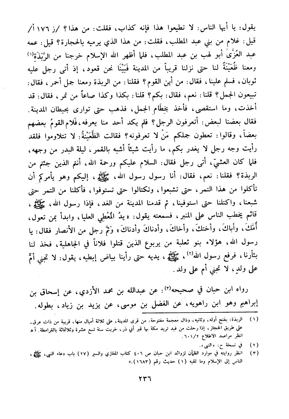 يَقُولُ يَا أَيُّهَا النَّاسُ لَا تُطِيعُوا هَذَا فَإِنَّهُ كَذَابٌ فَقُلْتُ مَنْ هَذَا قِيلَ غُلامٌ مِنْ بَنِي عَبْدِ الْمُطَّلِبِ فَقُلْتُ مَنْ هَذَا الَّذِي يَرْمِيهِ بِالْحِجَارَةِ قِيلَ عَمُّهُ عَبْدُ الْعُزَّى أَبُو لَهَبِ بْنُ عَبْدِ الْمُطَّلِبِ فَلَمَّا أَظْهَرَ اللَّهُ الإِسْلامَ خَرَجْنَا مِنَ الرَّبَذَةِ وَمَعَنَا ظُعَيْنَةٌ لَنَا حَتَّى نَزَلْنَا قَرِيبًا مِنَ الْمَدِينَةِ فَبَيْنَا نَحْنَ قُعُودٌ إِذْ أَتَى رَجُلٌ عَلَيْهِ ثَوْبَانِ فَسَلَّمَ عَلَيْنَا فَقَالَ مِنْ أَيْنَ الْقَوْمُ فَقُلْنَا مِنَ الرَّبَذَةِ وَمَعْنَا جَمَلٌ أَحْمَرُ فَقَالَ تَبِيعُونَ الْجَمَلَ قُلْنَا نَعَمْ فَقَالَ بِكَمْ قُلْنَا بِكَذَا وَكَذَا صَاعًا مِنْ تَمْرٍ فَقَالَ قَدْ أَخَذْتُ وَما اسْتَقْصَى فَأَخَذَ بِخِطَامِ الْجَمَلِ فَذَهَبَ حَتَّى تَوَارَى بِحِيطَانِ الْمَدِينَةِ فَقَالَ بَعْضُنَا لِبَعْضٍ أَتَعْرِفُونَ الرَّجُلَ فَلَمْ يَكَدْ أَحَدٌ مِنَّا يَعْرِفُهُ فَلامَ الْقَوْمُ بَعْضُهُمْ بَعْضًا وَقَالُوا تُعْطُونَ جَمَلَكُمْ مَنْ لَا تَعْرِفُونَهُ فَقَالَتِ الظُّعَيْنَةُ لَا تَتَلاوَمُوا فَلَقَدْ رَأَيْتُ وَجْهَ رَجُلٍ لَا يَغْدِرُ بِكُمْ مَا رَأَيْتُ شَيْئًا أَشْبَهَ بِالْقَمَرِ لَيْلَةَ الْبَدْرِ مِنْ وَجْهِهِ فَلَّمَا كَانَ الْعَشِيُّ أَتَى رَجُلٌ فَقَالَ السَّلامُ عَلَيْكُمْ وَرَحْمَةُ اللَّهِ أَنْتُمُ الَّذِينَ جِئْتُمْ مِنَ الرَّبَذَةِ فَقُلْنَا نَعَمْ فَقَالَ أَنا رَسُولُ رَسُولِ الله صلى الله عَلَيْهِ وَسلم إِلَيْكُمْ وَهُوَ يَأْمُرُكُمْ أَنْ تَأْكُلُوا مِنْ هَذَا التَّمْرِ حَتَّى تَشْبَعُوا وَتَكْتَالُوا حَتَّى تَسْتَوْفُوا فَأَكَلْنَا مِنَ التَّمْرِ حَتَّى شَبِعْنَا وَاكْتَلْنَا حَتَّى اسْتَوْفَيْنَا ثُمَّ قَدِمْنَا الْمَدِينَةَ مِنَ الْغَد فَإِذَا رَسُولُ اللَّهِ صَلَّى اللَّهُ عَلَيْهِ وَسلم قَائِمٌ يَخْطُبُ النَّاسَ عَلَى الْمِنْبَرِ فَسَمِعْتُهُ يَقُولُ يَدُ الْمُعْطِي الْعُلْيَا وَابْدَأْ بِمَنْ تَعُولُ أُمَّكَ وَأَبَاكَ وَأُخْتَكَ وَأَخَاكَ وَأَدْنَاكَ وَأَدْنَاكَ وَثَمَّ رَجُلٌ مِنَ الأَنْصَارِ فَقَالَ يَا رَسُولَ اللَّهِ هَؤُلاءِ بَنُو ثَعْلَبَةَ مِنْ يَرْبُوعٍ الَّذِينَ قَتَلُوا فُلانًا فِي الْجَاهِلِيَّةِ فَخُذْ لَنَا بِثَأْرِنَا فَرَفَعَ رَسُولُ اللَّهِ صَلَّى اللَّهُ عَلَيْهِ وَسَلَّمَ يَدَيْهِ حَتَّى رَأَيْنَا بَيَاضَ إِبِطَيْهِ يَقُولُ لَا تَجْنِي أُمٌّ عَلَى وَلَدٍ لَا تَجْنِي أُمٌّ عَلَى وَلَدٍ