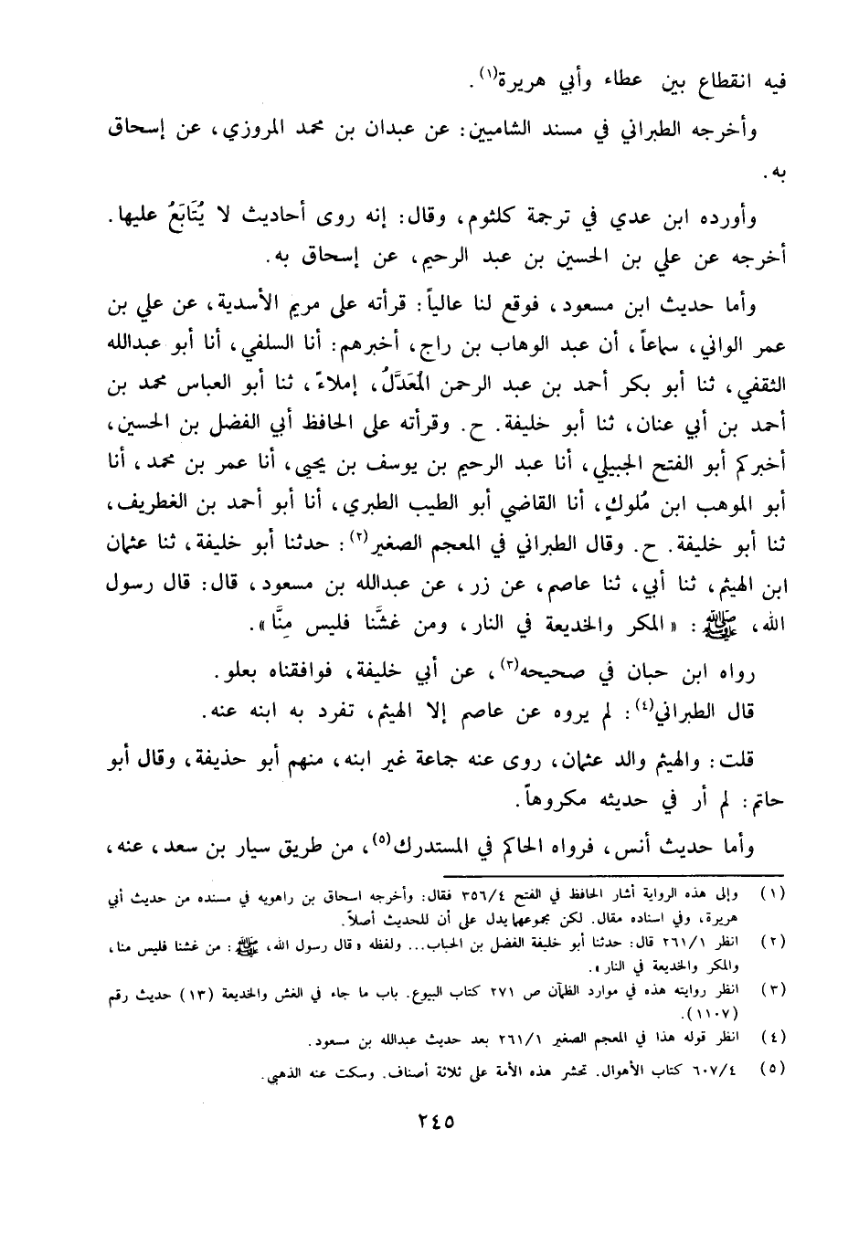 وَأما حَدِيث ابْن مَسْعُود فَوَقع لنا عَالِيا قرأته على مَرْيَم الأَسدِية عَنْ عَلِيِّ بْنِ عُمَرَ الْوَانِيِّ سَمَاعًا أَنَّ عَبْدَ الْوَهَّابِ بْنَ رَاجٍ أَخْبَرَهُمْ أَنا السَّلَفِيُّ أَنا أَبُو عَبْدِ اللَّهِ الثَّقَفِيُّ ثَنَا أَبُو بَكْرٍ أَحْمَدُ بْنُ عَبْدِ الرَّحْمَنِ الْمُعَدَّلُ إِمْلاءً ثَنَا أَبُو الْعَبَّاسِ مُحَمَّدُ بْنُ أَحَمْدَ بْنِ أَبِي عَنَانَ ثَنَا أَبُو خَلِيفَةَ ح وَقَرَأْتُهُ عَلَى الْحَافِظِ أَبِي الْفَضْلِ بْنِ الْحُسَيْنِ أَخْبَرَكُمْ أَبُو الْفَتْحِ الْجُبَيْلِيُّ أَنا عَبْدُ الرَّحِيمِ بْنُ يُوسُفَ بْنِ يَحْيَى أَنا عُمَرُ بْنُ مُحَمَّدٍ أَنا أَبُو الْمَوْهَبِ ابْن مُلُوكٍ أَنا الْقَاضِي أَبُو الطَّيِّبِ الطَّبَرِيُّ أَنا أَبُو أَحْمَدَ بْنُ الْغِطْرِيفِ ثَنَا أَبُو خَلِيفَةَ ح وَقَالَ الطَّبَرَانِيُّ فِي الْمُعْجَمِ الصَّغِيرِ حَدثنَا أَبُو خَلِيفَةَ ثَنَا عُثْمَانُ ابْن الْهَيْثَمِ ثَنَا أَبِي ثَنَا عَاصِمُ عَنْ زِرٍّ عَنْ عَبْدِ اللَّهِ بْنِ مَسْعُودٍ قَالَ قَالَ رَسُولُ الله صلى الله عَلَيْهِ وَسلم الْمَكْرُ وَالْخَدِيعَةُ فِي النَّارِ وَمَنْ غَشَّنَا فَلَيْسَ مِنَّا