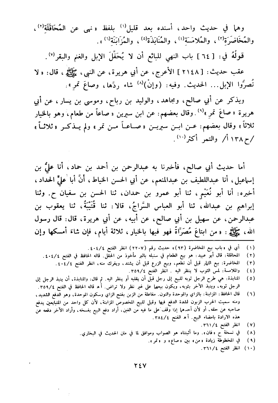 أما حَدِيث أبي صَالح فَأَخْبَرَنَا بِهِ عَبْدُ الرَّحْمَنِ بْنُ أَحْمَدَ بْنِ حَمَّادٍ أَنا عَلِيُّ ابْن إِسْمَاعِيلَ أَنا عَبْدُ اللَّطِيفِ بْنُ عَبْدِ الْمُنْعِمِ عَنْ أَبِي الْحَسَنِ الْخَيَّاطِ أَنَّ أَبَا عَلِيٍّ الْحَدَّادَ أَخْبَرَهُ أَنا أَبُو نُعَيْمٍ ثَنَا أَبُو عَمْرِو بْنُ حَمْدَانَ ثَنَا الْحسن ابْن سُفْيَانَ ح وثنا إِبْرَاهِيمُ بْنُ عَبْدِ اللَّهِ ثَنَا أَبُو الْعَبَّاسِ السَّرَّاجُ قَالا ثَنَا قُتَيْبَةُ ثَنَا يَعْقُوب بن عبد الرَّحْمَن عَن سُهَيْلِ بْنِ أَبِي صَالِحٍ عَنْ أَبِيه عَن أبي هُرَيْرَة قَالَ قَالَ رَسُول الله صلى الله عَلَيْهِ وَسَلَّمَ مَنِ ابْتَاعَ مُصَرَّاةً فَهُوَ فِيهَا بِالْخِيَارِ ثَلاثَةَ أَيَّامٍ فَإِن شَاءَ أمْسكهَا وَإِن
