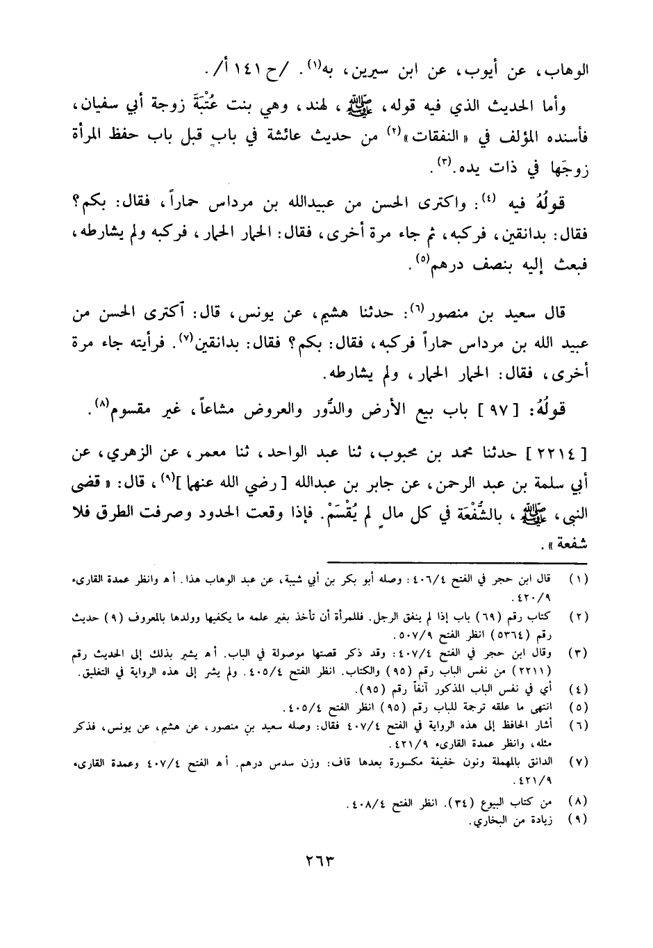 وَأما الحَدِيث الَّذِي فِيهِ قَوْله صلى الله عَلَيْهِ وَسلم لهِنْد وَهِي بنت عتبَة زَوْجَة أبي سُفْيَان فأسنده الْمُؤلف فِي النَّفَقَات من حَدِيث عَائِشَة فِي بَاب قبل بَاب حفظ الْمَرْأَة زَوجهَا فِي ذَات يَده