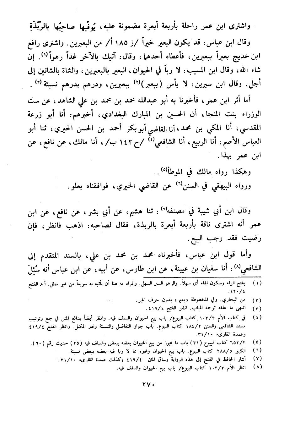 وَاشْترى ابْن عمر رَاحِلَة بأَرْبعَة أَبْعِرَة مَضْمُونَة عَلَيْهِ يوفيها صَاحبهَا بالربذة