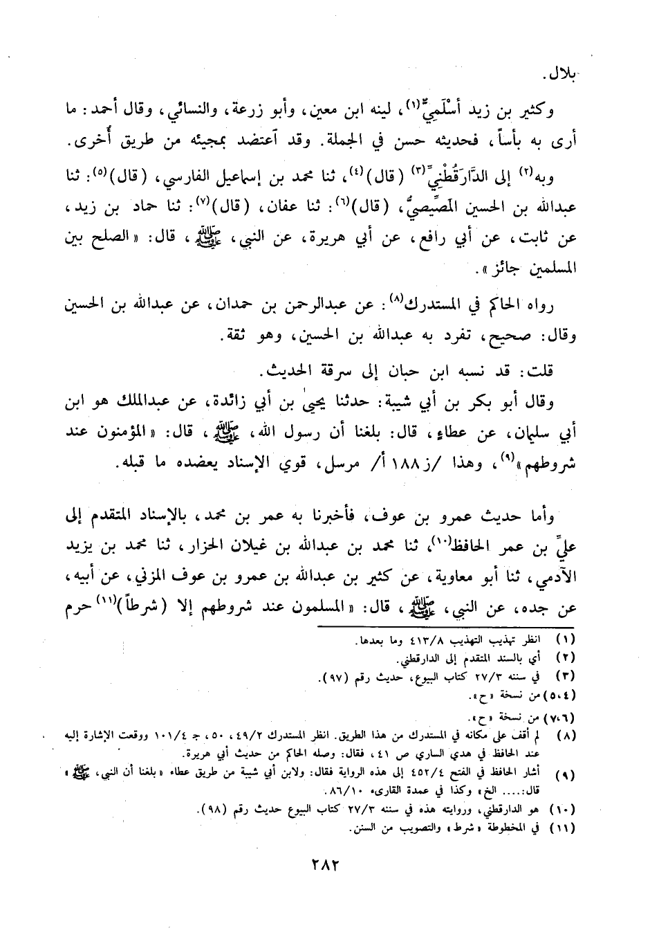 وَبِه إِلَى الدَّارَقُطْنِيّ قَالَ ثَنَا مُحَمَّدُ بْنُ إِسْمَاعِيلَ الْفَارِسِيُّ قَالَ ثَنَا عَبْدُ الله ابْن الْحُسَيْنِ الْمِصِّيصِيُّ قَالَ ثَنَا عَفَّانُ قَالَ ثَنَا حَمَّادُ بْنُ زَيْدٍ عَن ثَابت عَن أبي رَافع عَنْ أَبِي هُرَيْرَةَ عَنِ النَّبِيِّ صَلَّى اللَّهُ عَلَيْهِ وَسَلَّمَ قَالَ الصُّلْحُ بَيْنَ الْمُسْلِمِينَ جَائِزٌ