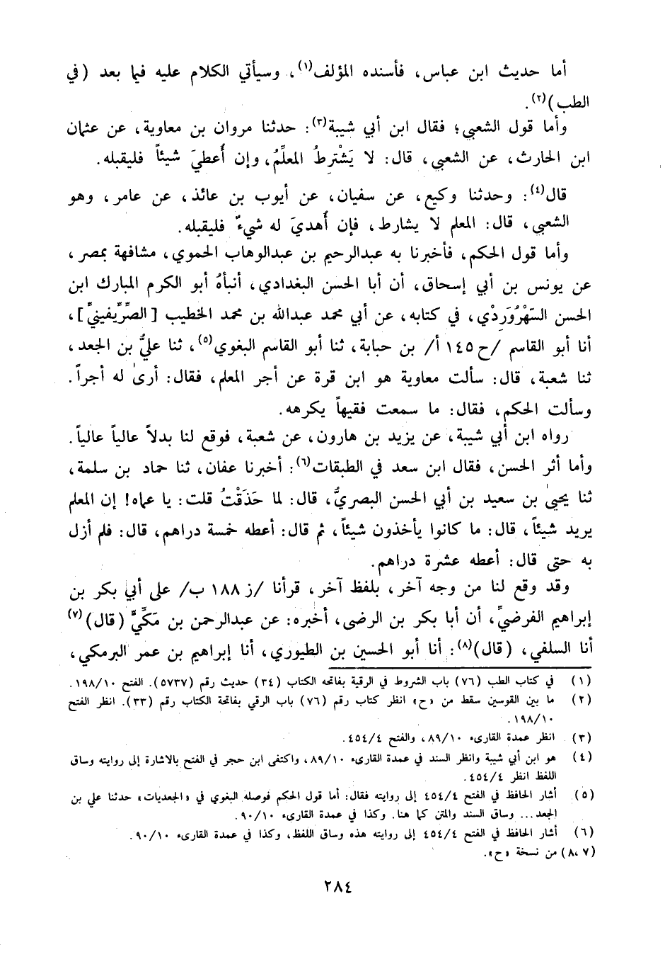 وَأما قَول الحكم فَأخْبرنَا بِهِ عبد الرَّحِيم بن عبد الْوَهَّاب الْحَمَوِيّ مشافهة بِمصْر عَن يُونُس بن أبي إِسْحَاق أَن أَبَا الْحسن الْبَغْدَادِيّ أنبأه أَبُو الْكَرم الْمُبَارك ابْن الْحسن السهروردي فِي كِتَابه عَن أبي مُحَمَّد عبد الله بن مُحَمَّد الْخَطِيب الصريفيني أَنا أَبُو الْقَاسِم بن حبابة ثَنَا أَبُو الْقَاسِم الْبَغَوِيّ ثَنَا عَليّ بن الْجَعْد ثَنَا شُعْبَة قَالَ سَأَلت مُعَاوِيَة هُوَ ابْن قُرَّة عَن أجر الْمعلم فَقَالَ أرى لَهُ أجرا وَسَأَلت الحكم فَقَالَ مَا سَمِعت فَقِيها يكرههُ