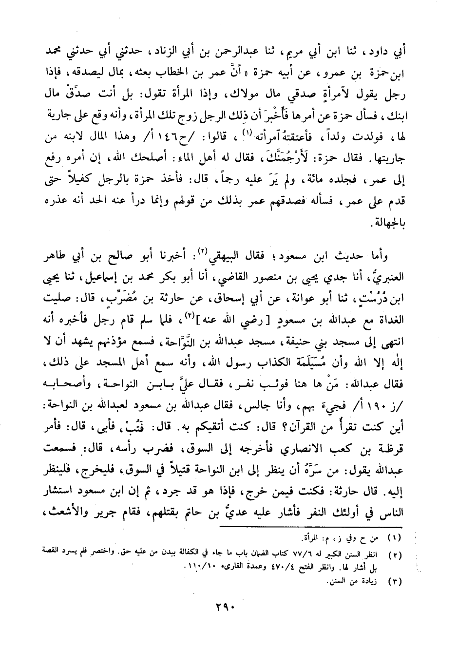 أَبِي دَاوُدَ ثَنَا ابْنُ أَبِي مَرْيَمَ ثَنَا عَبْدُ الرَّحْمَنِ بْنُ أَبِي الزِّنَادِ حَدَّثَنِي أَبِي حَدَّثَنِي مُحَمَّدِ بْنِ حَمْزَةَ بْنِ عَمْرٍو عَنْ أَبِيهِ حَمْزَةَ أَنَّ عُمَرَ بْنَ الْخَطَّابِ بَعَثَهُ بِمَالٍ لِيُصَدِّقَهُ فَإِذَا رَجُلٌ يَقُولُ لامْرَأَةٍ صَدِّقِي مَالَ مَوْلاكِ وَإِذَا الْمَرْأَةُ تَقُولُ بَلْ أَنْتَ صَدِّقْ مَالَ ابْنِكَ فَسَأَلَ حَمْزَةُ عَنْ أَمْرِهَا فَأُخْبِرَ أَنَّ ذَلِكَ الرَّجُلَ زَوْجُ تِلْكَ الْمَرْأَةِ وَأَنَّهُ وَقَعَ عَلَى جَارِيَةٍ لَهَا فَوَلَدَتْ وَلَدًا فَأَعْتَقَتْهُ امْرَأَتُهُ قَالُوا وَهَذَا الْمَالُ لابْنِهِ مِنْ جَارِيَتِهَا فَقَالَ حَمْزَةُ لأَرْجُمَنَّكَ فَقَالَ لَهُ أَهْلُ الْمَاءِ أَصْلَحَكَ اللَّهُ إِنَّ أَمْرَهُ رُفِعَ إِلَى عُمَرَ فَجَلَدَهُ مِائَةً وَلَمْ يَرَ عَلَيْهِ رَجْمًا قَالَ فَأَخَذَ حَمْزَةُ بِالرَّجُلِ كَفِيلا حَتَّى قَدِمَ عَلَى عُمَرَ فَسَأَلَهُ فَصَدَّقَهُمْ عُمَرُ بِذَلِكَ مِنْ قَوْلِهِمْ وَإِنَّمَا دَرَأَ عَنْهُ الْحَدَّ أَنَّهُ عَذَرَهُ بِالْجَهَالَةِ