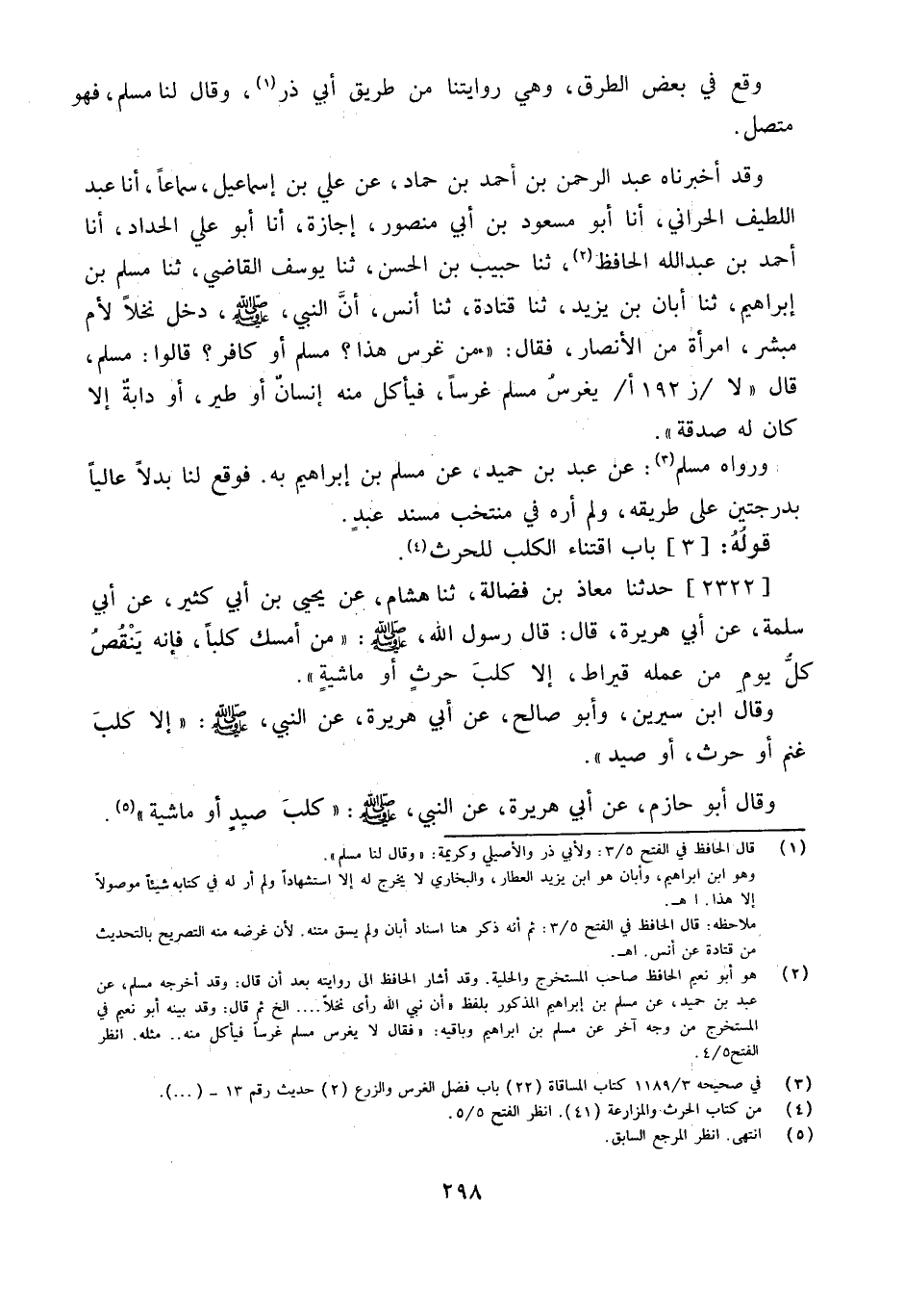 وَقد أَخْبَرَنَاهُ عَبْدُ الرَّحْمَنِ بْنُ أَحْمَدَ بْنِ حَمَّادٍ عَنْ عَلِيِّ بْنِ إِسْمَاعِيلَ سَمَاعًا أَنا عَبْدُ اللَّطِيفِ الْحَرَّانِيُّ أَنا أَبُو مَسْعُودِ بْنُ أَبِي مَنْصُورٍ إِجَازَةً أَنا أَبُو عَلِيٍّ الْحَدَّادُ أَنا أَحْمَدُ بن عبد الله الْحَافِظ ثَنَا حَبِيبُ بْنُ الْحَسَنِ ثَنَا يُوسُفُ الْقَاضِي ثَنَا مُسْلِمُ بْنُ إِبْرَاهِيمَ ثَنَا أَبَانُ بْنُ يَزِيدَ ثَنَا قَتَادَةُ ثَنَا أَنَسٌ أَنَّ النَّبِيَّ صَلَّى اللَّهُ عَلَيْهِ وَسَلَّمَ دَخَلَ نَخْلا لأُمِّ مُبَشِّرٍ امْرَأَةٍ مِنَ الأَنْصَارِ فَقَالَ مَنْ غَرَسَ هَذَا مُسْلِمٌ أَوْ كَافِرٌ قَالُوا مُسْلِمٌ قَالَ لَا يَغْرِسُ الْمُسْلِمُ غَرْسًا فَيَأْكُلُ مِنْهُ إِنْسَانٌ أَوْ طَيْرٌ أَوْ دَابَّةٌ إِلا كَانَ لَهُ صَدَقَةٌ