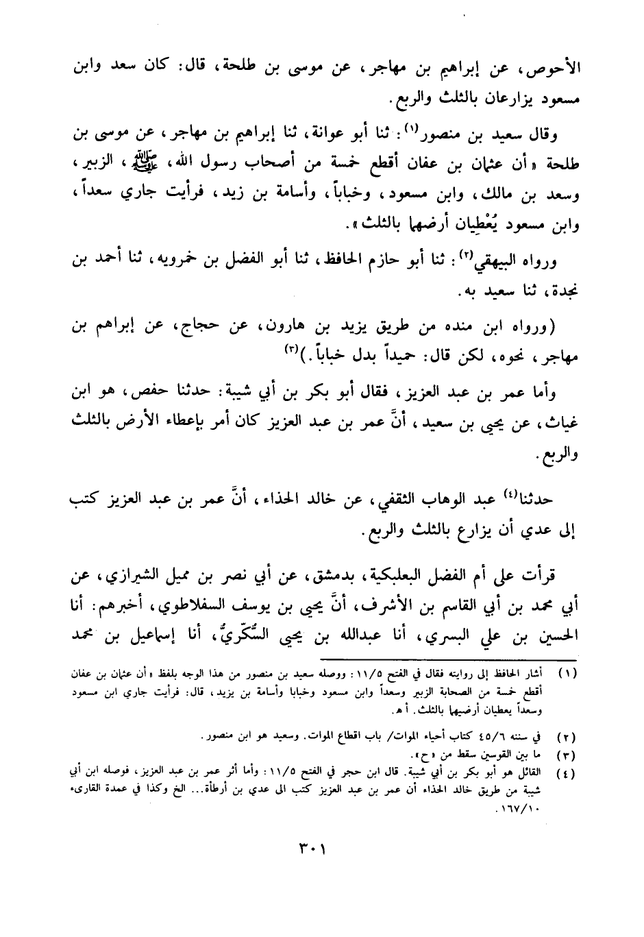 وَقَالَ سعيد بن مَنْصُور ثَنَا أَبُو عَوَانَةَ ثَنَا إِبْرَاهِيمَ بْنِ مُهَاجِرٍ عَنْ مُوسَى ابْن طَلْحَةَ أَنَّ عُثْمَانَ بْنَ عَفَّانَ أَقْطَعَ خَمْسَةً مِنْ أَصْحَابِ رَسُولِ الله صلى الله عَلَيْهِ وَسلم الزُّبَيْرَ وَسَعْدَ بْنَ مَالِكٍ وَابْنَ مَسْعُودٍ وَخَبَّابًا وَأُسَامَةَ بْنَ زَيْدٍ فَرَأَيْتُ جَارِي سَعْدًا وَابْنَ مَسْعُودٍ يُعْطِيَانِ أَرْضَهُمَا بِالثُّلُثِ