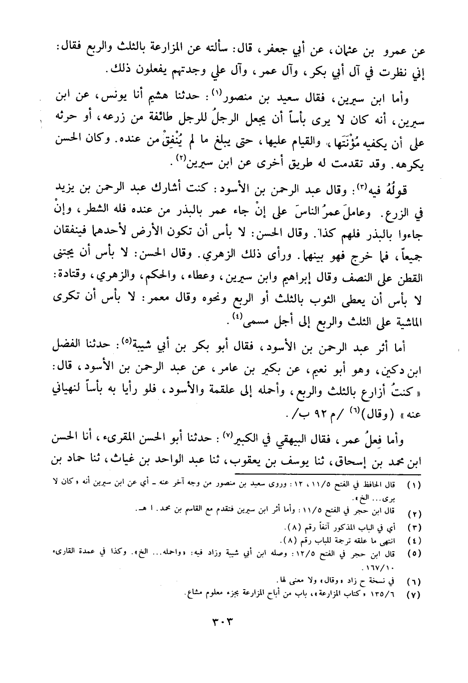 وَقَالَ عبد الرَّحْمَن بن الْأسود كنت أشارك عبد الرَّحْمَن بن يزِيد فِي الزَّرْع وعامل عمر النَّاس على إِن جَاءَ عمر بالبذر من عِنْده فَلهُ الشّطْر وَإِن جَاءُوا بالبذر فَلهم كَذَا وَقَالَ الْحسن لَا بَأْس أَن تكون الأَرْض لأَحَدهمَا فينفقان جَمِيعًا فَمَا خرج فَهُوَ بَينهمَا وَرَأى ذَلِك الزُّهْرِيّ وَقَالَ الْحسن لَا بَأْس أَن يجتنى الْقطن على النّصْف وَقَالَ إِبْرَاهِيم وَابْن سِيرِين وَعَطَاء وَالْحكم وَالزهْرِيّ وَقَتَادَة لَا بَأْس أَن يعْطى الثَّوْب بِالثُّلثِ أَو الرّبع وَنَحْوه وَقَالَ معمر لَا بَأْس أَن تكرى الْمَاشِيَة على الثُّلُث وَالرّبع إِلَى أجل مُسَمّى