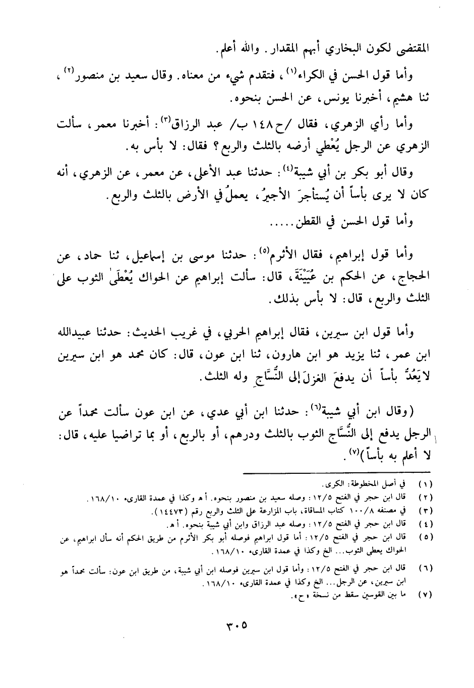 وَقَالَ ابْن أبي شيبَة حَدَّثنا ابْن أبي عدي عَن ابْن عون سَأَلت مُحَمَّدًا عَن الرجل يدْفع إِلَى النساج الثَّوْب بِالثُّلثِ وَدِرْهَم أَو بِالربعِ أَو بِمَا تَرَاضيا عَلَيْهِ قَالَ لَا أعلم بِهِ بَأْسا