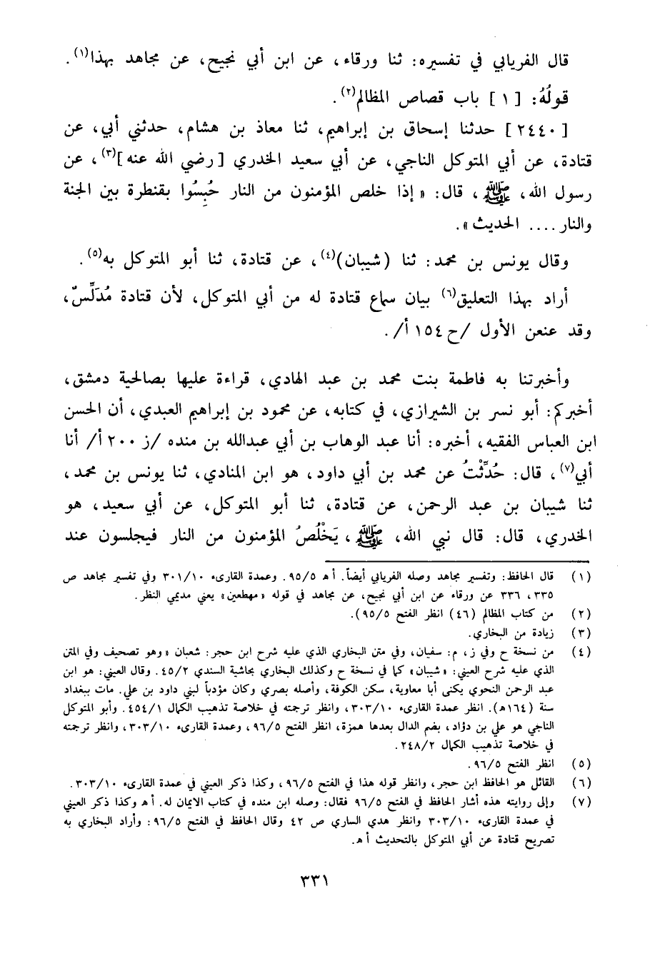 2440 - حَدثنَا إِسْحَاق بن إِبْرَاهِيم ثَنَا معَاذ بن هِشَام حَدثنِي أبي عَن قَتَادَة عَن أبي المتَوَكل النَّاجِي عَن أبي سَعِيدٍ الْخُدْرِيِّ رَضِيَ اللَّهُ عَنْهُ عَنْ رَسُولِ اللَّهِ صَلَّى اللَّهُ عَلَيْهِ وَسلم قَالَ إِذا خلص الْمُؤْمِنُونَ من النَّار حبسوا بقنطرة بَين الْجنَّة وَالنَّار الحَدِيث