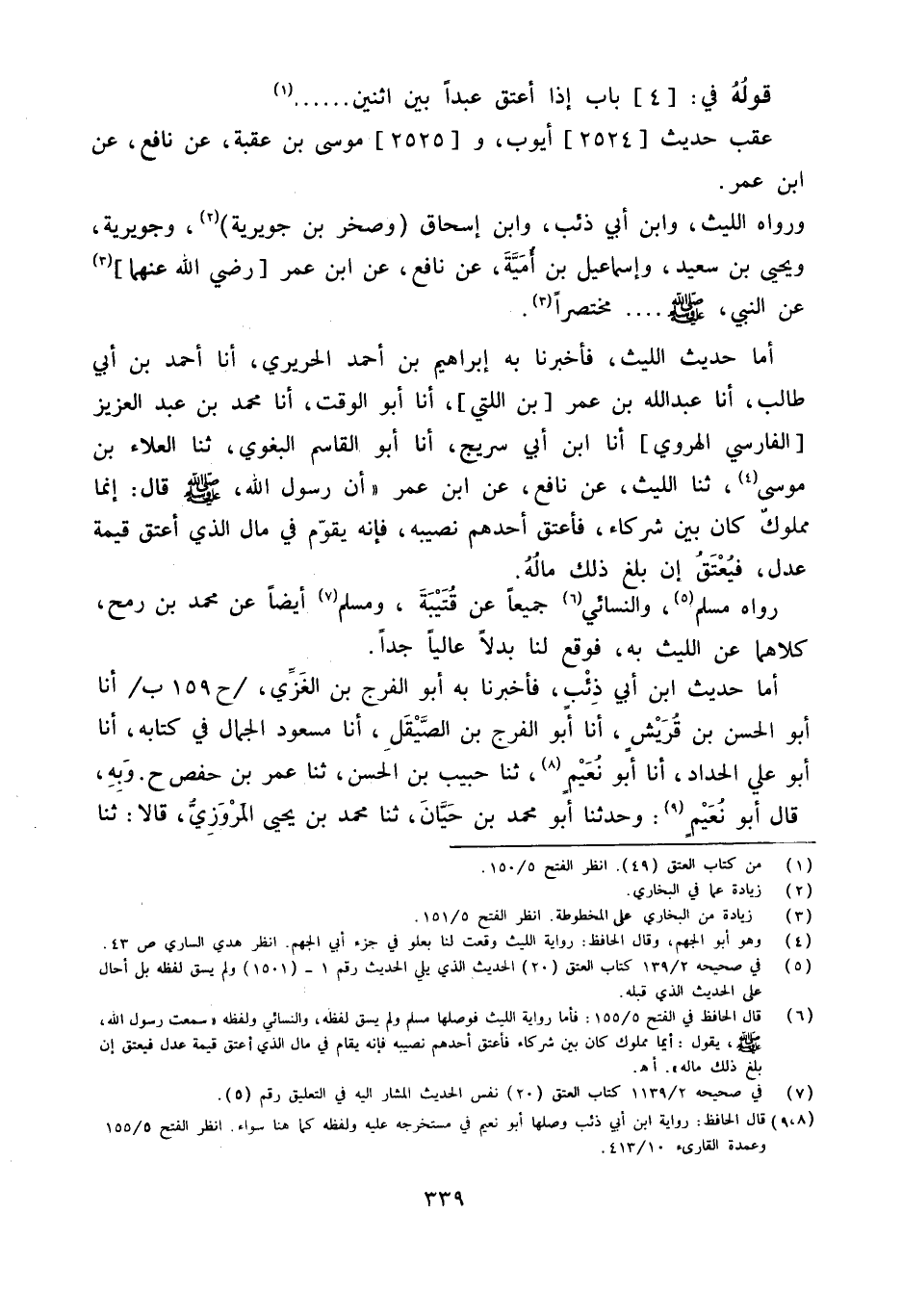 أما حَدِيث اللَّيْث فَأخبرنا بِهِ إِبْرَاهِيمُ بْنُ أَحْمَدَ الْحَرِيرِيُّ أَنا أَحْمَدُ بن أبي طَالب أَنا عبد الله بن عمر بن اللتي أَنا أَبُو الْوَقْت أَنا مُحَمَّد بْنُ عَبْدِ الْعَزِيزِ الْفَارِسِيُّ الْهَرَوِيُّ أَنا ابْنُ أَبِي سُرَيْجٍ أَنا أَبُو الْقَاسِمِ الْبَغَوِيُّ ثَنَا الْعَلاءُ بن مُوسَى ثَنَا اللَّيْث عَن نَافِعٍ عَنِ ابْنِ عُمَرَ أَنَّ رَسُول الله صلى الله عَلَيْهِ وَسَلَّمَ قَالَ إِنَّمَا مَمْلُوكٌ كَانَ بَيْنَ شُرَكَاءَ فَأَعْتَقَ أَحَدُهُمْ نَصِيبَهُ فَإِنَّهُ يُقَوَّمُ فِي مَالِ الَّذِي أَعْتَقَ قِيمَةَ عَدْلٍ فَيُعْتَقُ إِنْ بَلَغَ ذَلِكَ مَالُهُ