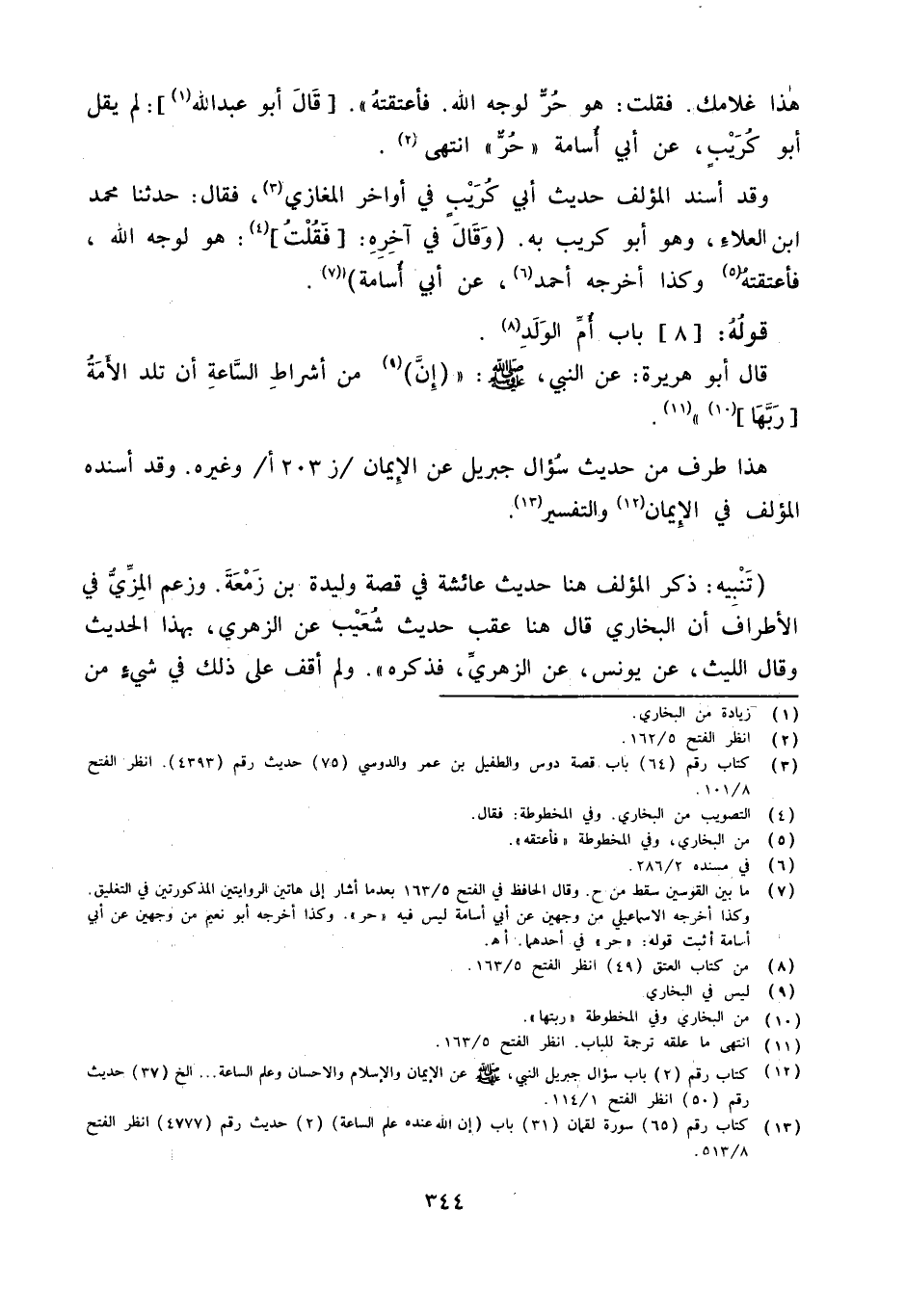 هَذَا غُلامُكَ فَقُلْتُ هُوَ حُرٌّ لِوَجْهِ اللَّهِ فَأَعْتَقْتُهُ قَالَ أَبُو عبد الله لم يقل أَبُو كريب عَن أبي أُسَامَة حر انْتهى