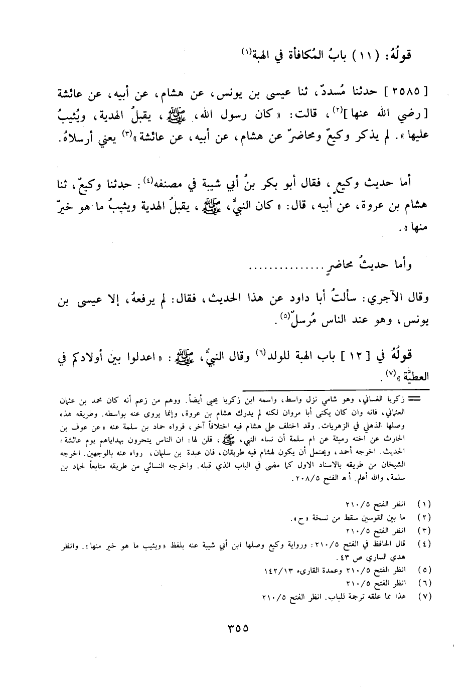 أما حَدِيث وَكِيع فَقَالَ أَبُو بكر بن أبي شيبَة فِي مُصَنفه حَدثنَا وَكِيعٌ ثَنَا هِشَامُ بْنُ عُرْوَةَ عَنْ أَبِيهِ قَالَ كَانَ النَّبِي صلى الله عَلَيْهِ وَسلم يَقْبَلُ الْهَدِيَّةَ وَيُثِيبُ مَا هُوَ خَيْرٌ مِنْهَا