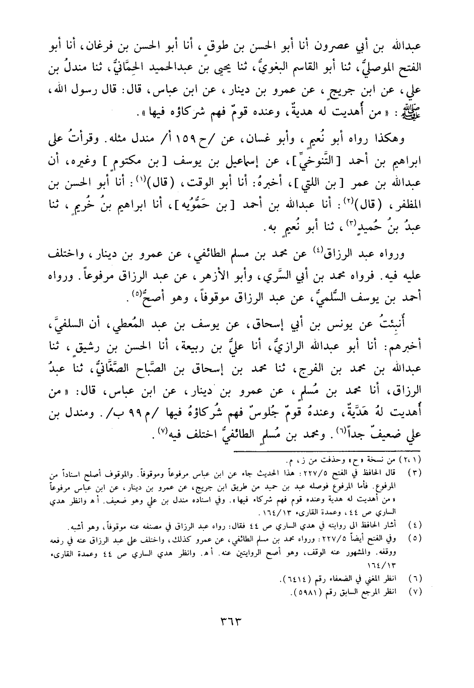 أُنْبِئْتُ عَنْ يُونُسَ بْنِ أَبِي إِسْحَاقَ عَنْ يُوسُفَ بْنِ عَبْدِ الْمُعْطِي أَنَّ السِّلَفِيَّ أَخْبَرَهُمْ أَنا أَبُو عَبْدِ اللَّهِ الرَّازِيُّ أَنا عَلِيُّ بْنُ رَبِيعَةَ أَنا الْحَسَنُ بْنُ رَشِيقٍ ثَنَا عَبْدُ اللَّهِ بْنُ مُحَمَّدِ بْنِ الْفَرَجِ ثَنَا مُحَمَّدُ بْنُ إِسْحَاقَ بْنِ الصَّبَّاحِ الصَّغَانِيُّ ثَنَا عَبْدُ الرَّزَّاقِ أَنا مُحَمَّدُ بْنُ مُسْلِمٍ عَنْ عَمْرِو بْنِ دِينَارٍ عَنِ ابْنِ عَبَّاسٍ قَالَ مَنْ أُهْدِيَتْ لَهُ هَدِيَّةٌ وَعِنْدَهُ قَوْمٌ جُلُوسٌ فَهُمْ شُرَكَاؤُهُ فِيهَا ومندل بن عَليّ ضَعِيف جدا وَمُحَمّد بن مُسلم الطَّائِفِي اخْتلف فِيهِ