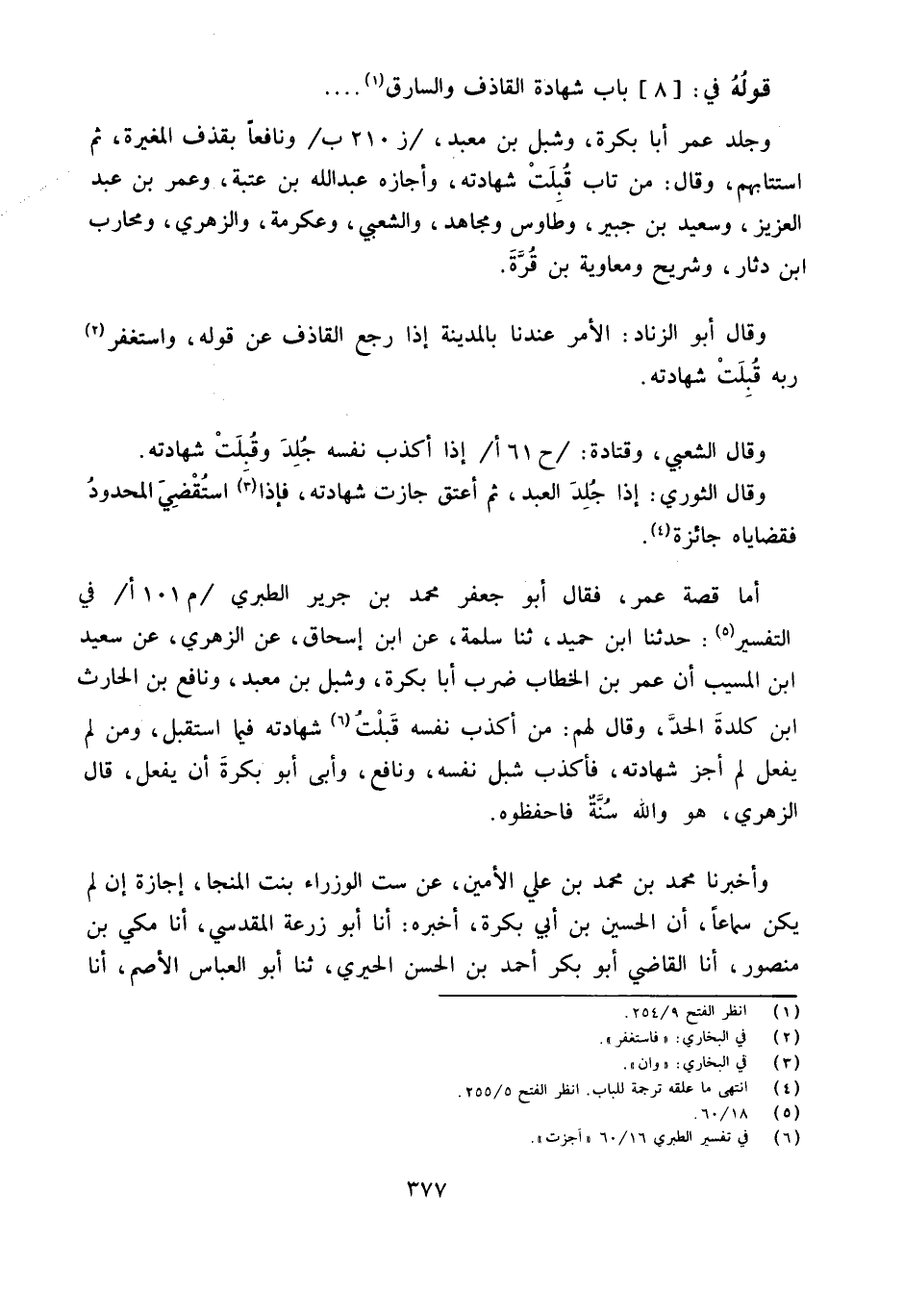 أما قصَّة عمر فَقَالَ أَبُو جَعْفَر مُحَمَّد بن جرير الطَّبَرِيّ فِي التَّفْسِير حَدثنَا ابْنُ حُمَيْدٍ ثَنَا سَلَمَةُ عَنِ ابْنِ إِسْحَاقَ عَن الزُّهْرِيّ عَن سعيد بن الْمُسَيِّب أَنَّ عُمَرَ بْنَ الْخَطَّابِ ضَرَبَ أَبَا بَكْرَةَ وَشِبْلَ بْنَ مَعْبَدٍ وَنَافِعَ بْنَ الْحَارِثِ بْنِ كِلْدَةَ الْحَدَّ وَقَالَ لَهُمْ مَنْ أَكْذَبَ نَفْسَهُ قَبَلْتُ شَهَادَتُهُ فِيمَا اسْتَقْبَلَ وَمَنْ لَمْ يَفْعَلْ لَمْ أُجِزْ شَهَادَتُهُ فَأَكْذَبَ شِبْلٌ نَفْسَهُ وَنَافِعٌ وَأَبَى أَبِو بَكْرَةَ أَنْ يَفْعَلَ قَالَ الزُّهْرِيّ هُوَ وَالله سنة فاحفظوه