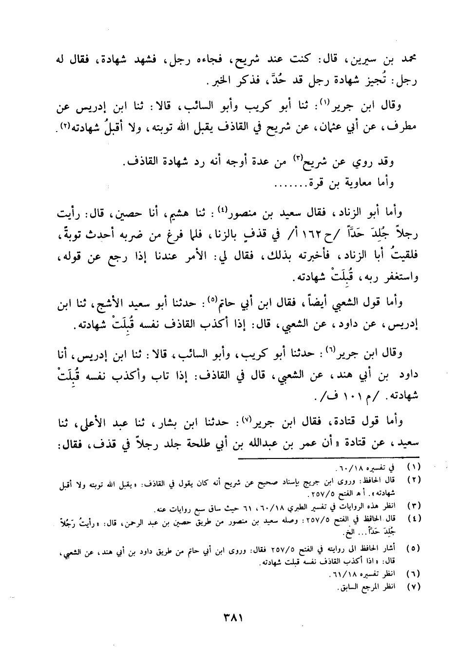وَقَالَ ابْن جرير ثَنَا أَبُو كريب وَأَبُو السَّائِب قَالَا ثَنَا ابْن إِدْرِيس عَن مطرف عَن أبي عُثْمَان عَن شُرَيْح فِي الْقَاذِف يقبل الله تَوْبَته وَلَا أقبل شَهَادَته