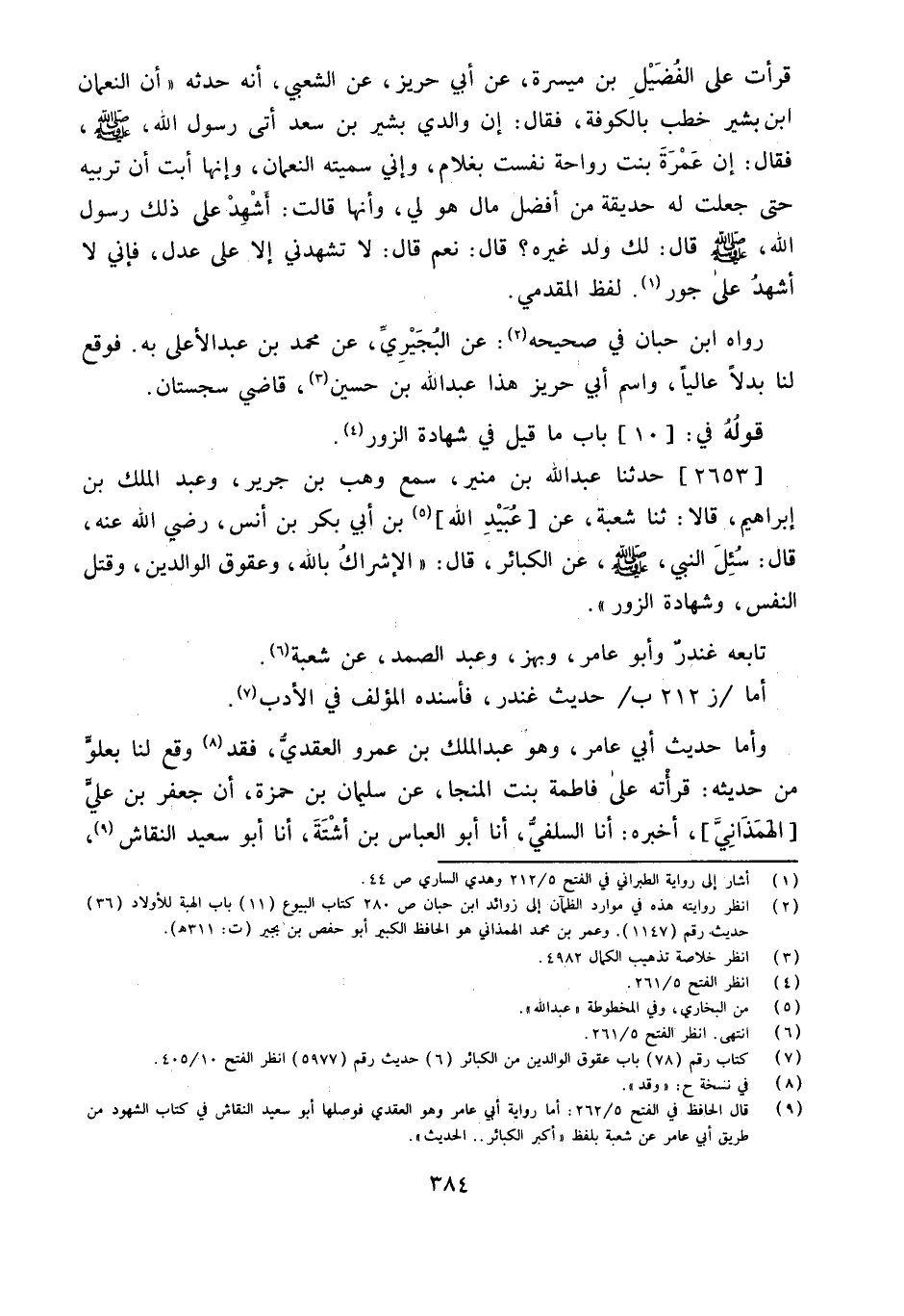 قَرَأت عَلَى الْفُضَيْلِ بْنِ مَيْسَرَةَ عَنْ أَبِي حَرِيزٍ عَنِ الشَّعْبِيِّ أَنه حَدثهُ أَن النُّعْمَان ابْن بَشِيرٍ خَطَبَ بِالْكُوفَةِ فَقَالَ إِنَّ وَالِدِي بَشِيرَ بْنَ سَعْدٍ أَتَى رَسُول الله صلى الله عَلَيْهِ وَسَلَّمَ فَقَالَ إِنَّ عَمْرَةَ بِنْتَ رَوَاحَةِ نَفِسَتْ بِغُلامٍ وَإِنِّي سَمَّيْتُهُ النُّعْمَانَ وَإِنَّهَا قَالَتْ أَشْهِدْ عَلَى ذَلِكَ رَسُولَ اللَّهِ صَلَّى اللَّهُ عَلَيْهِ وَسَلَّمَ قَالَ لَكِ وَلَدٌ غَيْرَهُ قَالَ نَعَمْ قَالَ لَا تُشْهِدْنِي إِلا عَلَى عَدْلٍ فَإِنِّي لَا أَشْهَدُ عَلَى جَوْرٍ لفظ الْمقدمِي
