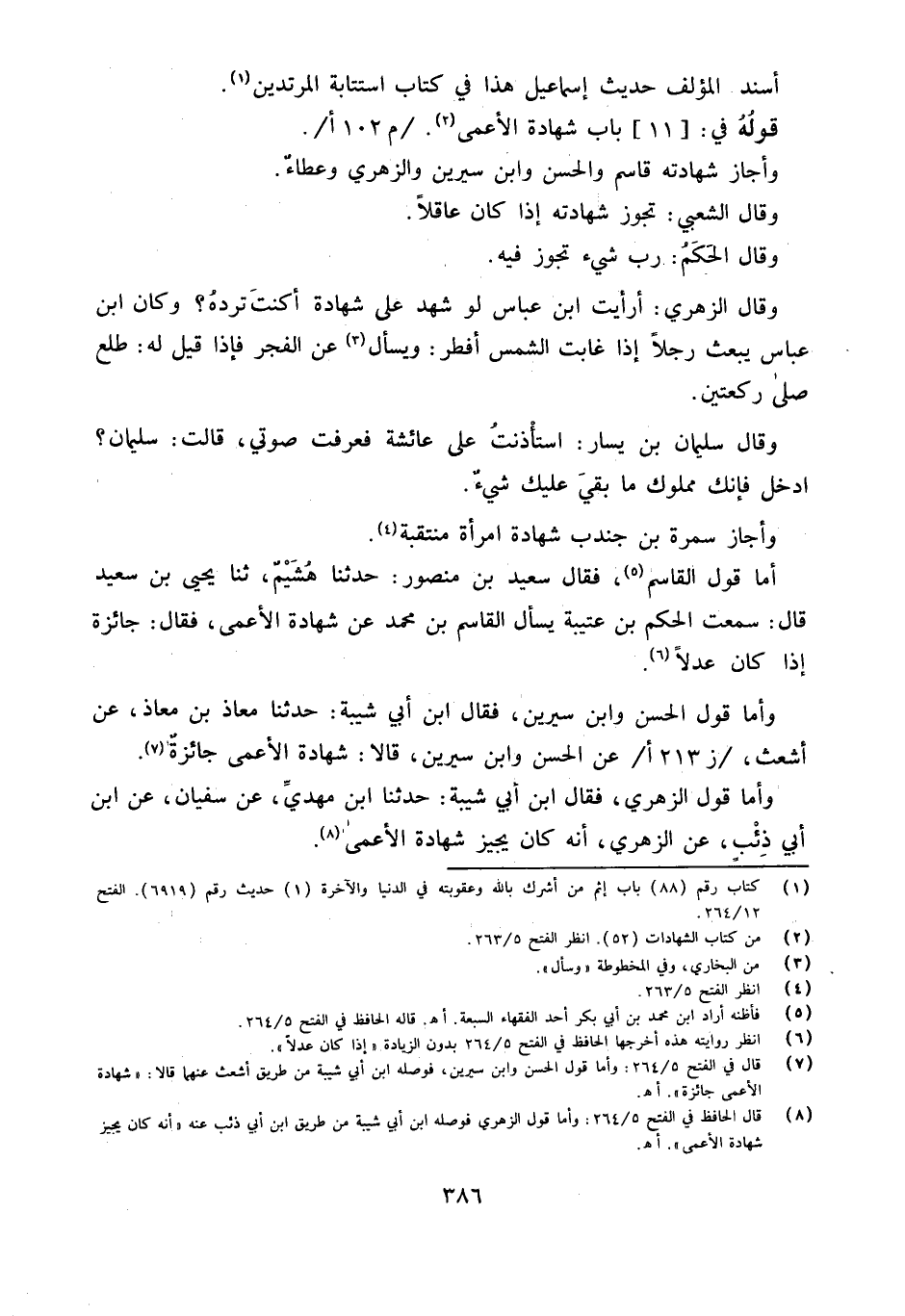 أما قَول الْقَاسِم فَقَالَ سعيد بن مَنْصُور حَدَّثنا هُشَيْمٌ ثَنَا يَحْيَى بْنُ سَعِيدٍ قَالَ سَمِعت الحكم بن عتيبة يسْأَل الْقَاسِم بن مُحَمَّد عَن شَهَادَة الْأَعْمَى فَقَالَ جَائِزَة إِذا كَانَ عدلا