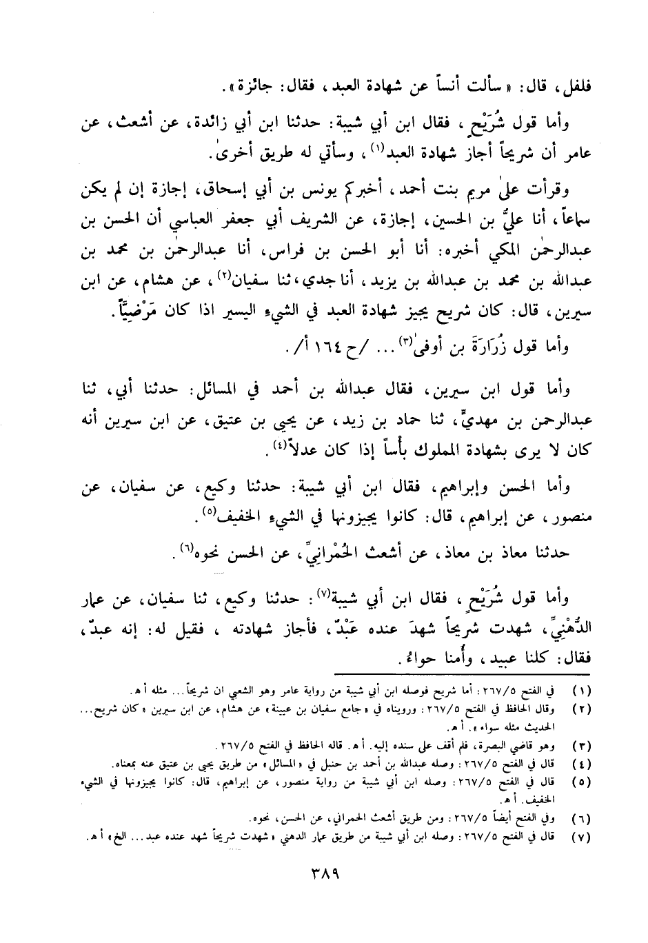 وقرأت على مَرْيَم بنت أَحْمد أخْبركُم يُونُس بن أبي إِسْحَاق إجَازَة إِن لم يكن سَمَاعا أَنا عَليّ بن الْحُسَيْن إجَازَة عَن الشريف أبي جَعْفَر العباسي أَن الْحسن بن عبد الرَّحْمَن الْمَكِّيّ أخبرهُ أَنا أَبُو الْحسن بن فراس أَنا عبد الرَّحْمَن ابْن مُحَمَّد بن عبد الله بن مُحَمَّد بن عبد الله بن يزِيد أَنا جدي ثَنَا سُفْيَان عَن هِشَام عَن ابْن سِيرِين قَالَ كَانَ شُرَيْح يُجِيز شَهَادَة العَبْد فِي الشَّيْء الْيَسِير إِذا كَانَ مرضيا