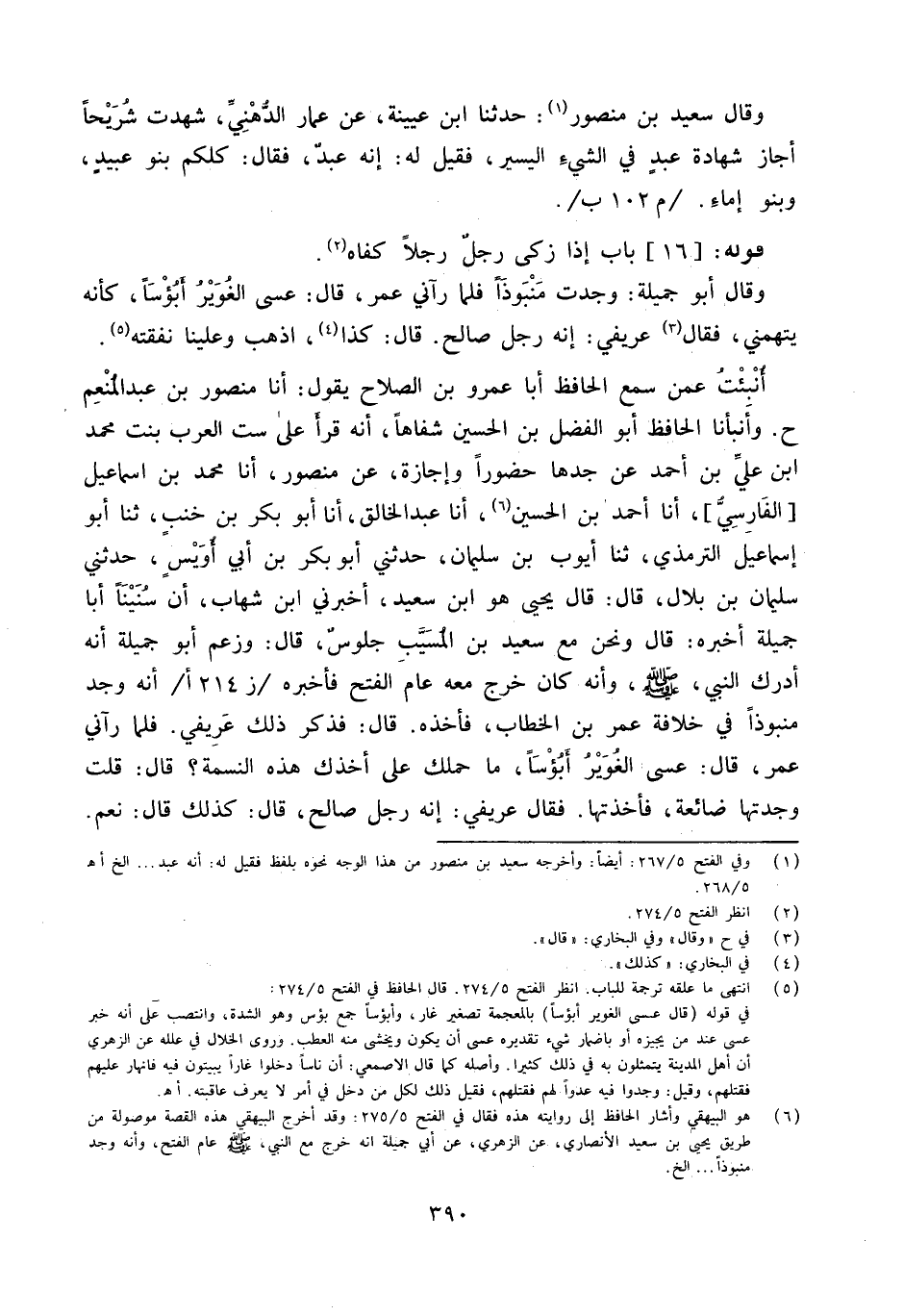 أُنْبِئْتُ عَمَّنْ سَمِعَ الْحَافِظَ أَبَا عَمْرِو بْنِ الصَّلاحِ يَقُولُ أَنا مَنْصُورُ بْنُ عَبْدِ الْمُنعم ح وأنبأنا الْحَافِظ أَبَا الْفضل بن الْحُسَيْن شِفَاهًا أَنَّهُ قَرَأَ عَلَى سِتِّ الْعَرَبِ بِنْتِ مُحَمَّدِ بْنِ عَلِيِّ بْنِ أَحْمَدَ عَنْ جَدِّهَا حُضُورًا وَإِجَازَةً عَنْ مَنْصُورٍ أَنا مُحَمَّدُ ابْن إِسْمَاعِيل الْفَارِسِي أَنا أَحْمد بن الْحُسَيْنِ أَنا عَبْدُ الْخَالِقِ أَنا أَبُو بكر ابْن خَنْبٍ ثَنَا أَبُو إِسْمَاعِيلَ التِّرْمِذِيُّ ثَنَا أَيُّوبُ بْنُ سُلَيْمَانَ حَدَّثَنِي أَبُو بكر ابْن أَبِي أُوَيْسٍ حَدَّثَنِي سُلَيْمَانُ بْنُ بِلالٍ قَالَ قَالَ يَحْيَى هُوَ ابْنُ سَعِيدٍ أَخْبرنِي ابْنُ شِهَابٍ أَنَّ سُنَيْنًا أَبَا جَمِيلَةَ أَخْبَرَهُ قَالَ وَنَحْنُ مَعَ سَعِيدِ بْنِ الْمُسَيِّبِ جُلُوسٌ قَالَ وَزَعَمَ أَبُو جَمِيلَةَ أَنَّهُ أَدْرَكَ النَّبِيَّ صَلَّى اللَّهُ عَلَيْهِ وَسَلَّمَ وَأَنَّهُ كَانَ خَرَجَ مَعَهُ عَامَ الْفَتْحِ فَأَخْبَرَهُ أَنَّهُ وَجَدَ مَنْبُوذًا فِي خِلافَةِ عُمَرَ بْنِ الْخَطَّابِ فَأَخَذَهُ قَالَ فَذَكَرَ ذَلِكَ عَرِيفِي فَلَمَّا رَآنِي عمر قَالَ عَسى الغوير أبؤسا مَا حَمَلَكَ عَلَى أَخْذِكَ هَذِهِ النَّسَمَةَ قَالَ قُلْتُ وَجَدْتُهَا ضَائِعَةً فَأَخَذْتُهَا فَقَالَ عَرِيفِي إِنَّهُ رَجُلٌ صَالِحٌ قَالَ كَذَلِكَ قَالَ نَعَمْ