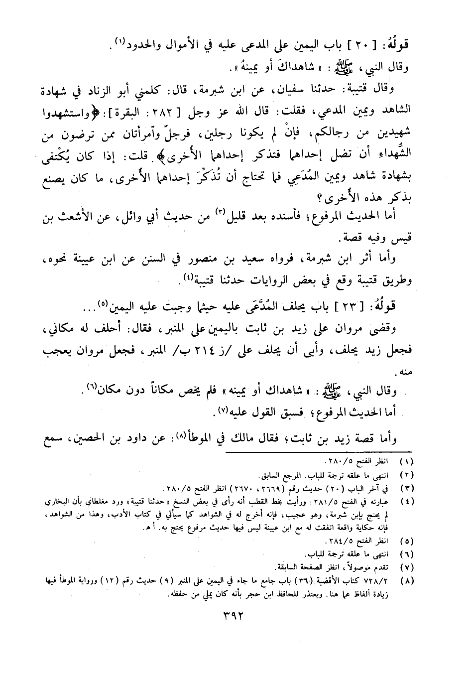 وَقَالَ قُتَيْبَة حَدثنَا سُفْيَان عَن ابْن شبْرمَة قَالَ كلمني أَبُو الزِّنَاد فِي شَهَادَة الشَّاهِد وَيَمِين الْمُدَّعِي فَقلت قَالَ الله عز وَجل 282 الْبَقَرَة {وَاسْتَشْهِدُوا شَهِيدَيْنِ مِنْ رِجَالِكُمْ فَإِنْ لَمْ يَكُونَا رَجُلَيْنِ فَرَجُلٌ وَامْرَأَتَانِ مِمَّنْ تَرْضَوْنَ مِنَ الشُّهَدَاءِ أَنْ تَضِلَّ إِحْدَاهُمَا فَتُذَكِّرَ إِحْدَاهُمَا الأُخْرَى} قلت إِذا كَانَ يكْتَفى بِشَهَادَة شَاهد وَيَمِين الْمُدَّعِي فَمَا تحْتَاج أَن تذكر إِحْدَاهمَا الْأُخْرَى مَا كَانَ يصنع بِذكر هَذِه الْأُخْرَى