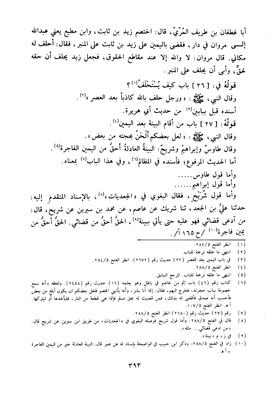 وَأما قَول شُرَيْح فَقَالَ الْبَغَوِيّ فِي الجعديات بِالْإِسْنَادِ الْمُتَقَدّم إِلَيْهِ حَدثنَا عَليّ بن الْجَعْد ثَنَا شريك عَن عَاصِم عَن مُحَمَّد بن سِيرِين عَن شُرَيْح قَالَ من ادّعى قضائي فَهُوَ عَلَيْهِ حَتَّى يَأْتِي بِبَيِّنَة الْحق أَحَق من قضائي الْحق أَحَق من يَمِين فاجرة