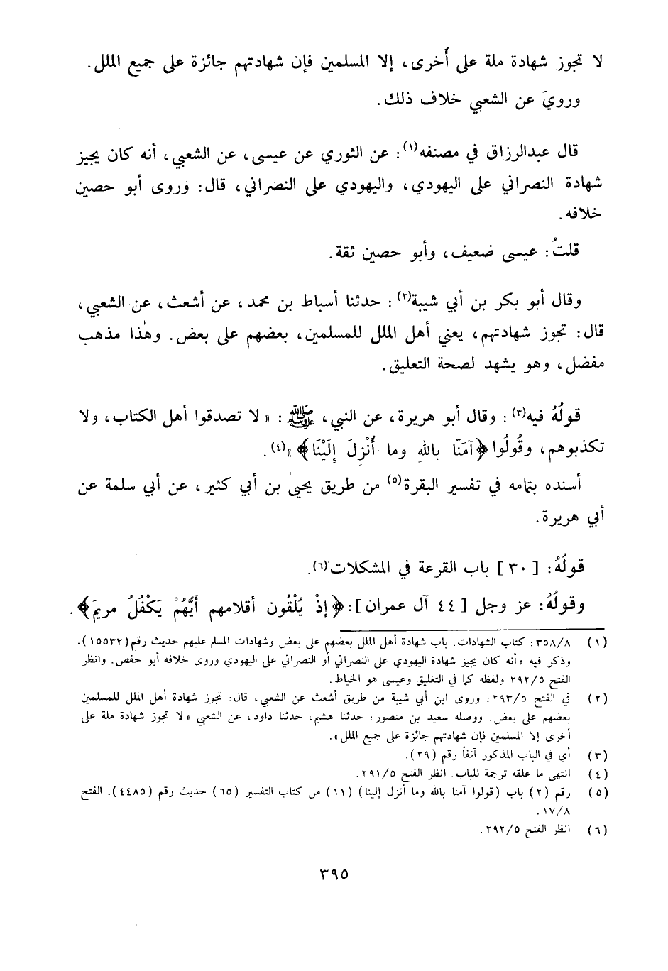 قَالَ عبد الرَّزَّاق فِي مُصَنفه عَن الثَّوْريّ عَن عِيسَى عَن الشّعبِيّ أَنه كَانَ يُجِيز شَهَادَة النَّصْرَانِي على الْيَهُودِيّ واليهودي على النَّصْرَانِي قَالَ وروى أَبُو حُصَيْن خِلَافه