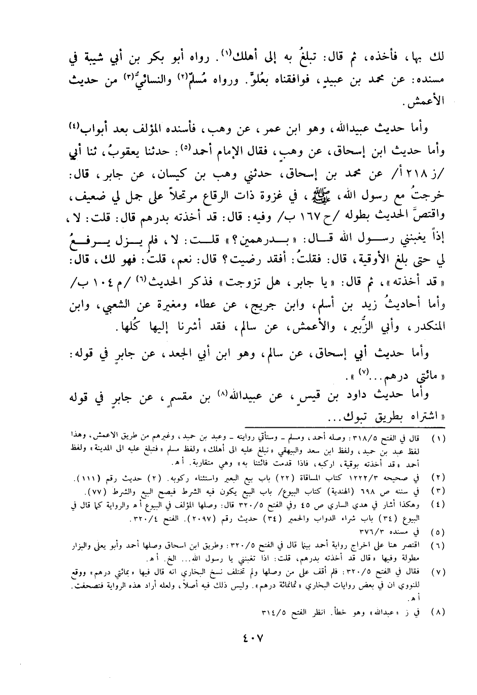 وَأما حَدِيث عبيد الله وَهُوَ ابْن عمر عَن وهب فأسنده الْمُؤلف بعد أَبْوَاب وَأما حَدِيث ابْن أسْحَاق عَن وهب فَقَالَ الإِمَام أَحْمد حَدثنَا يَعْقُوبُ ثَنَا أبي عَن مُحَمَّد بن إِسْحَاق حَدثنِي وهب بن كيسَان عَن جَابر قَالَ خرجت مَعَ رَسُول الله صلى الله عَلَيْهِ وَسلم فِي عزوة ذَات الرّقاع مرتحلا على جمل لي ضَعِيف واقتص الحَدِيث بِطُولِهِ وَفِيه قَالَ قد أَخَذته بدرهم قَالَ قلت لَا إِذا يغبنني رَسُول الله قَالَ بِدِرْهَمَيْنِ قلت لَا فَلم يزل يرفع لي حَتَّى بلغ الْأُوقِيَّة قَالَ فَقلت أفقد رضيت قَالَ نعم قلت فَهُوَ لَك قَالَ قد أَخَذته ثمَّ قَالَ يَا جَابر هَل تزوجت فَذكر الحَدِيث وَأما أَحَادِيث زيد بن أسلم وَابْن جريج عَن عَطاء ومغيرة عَن الشّعبِيّ وَابْن الْمُنْكَدر وَأبي الزبير وَالْأَعْمَش عَن سَالم فقد أَشَرنَا إِلَيْهَا كلهَا