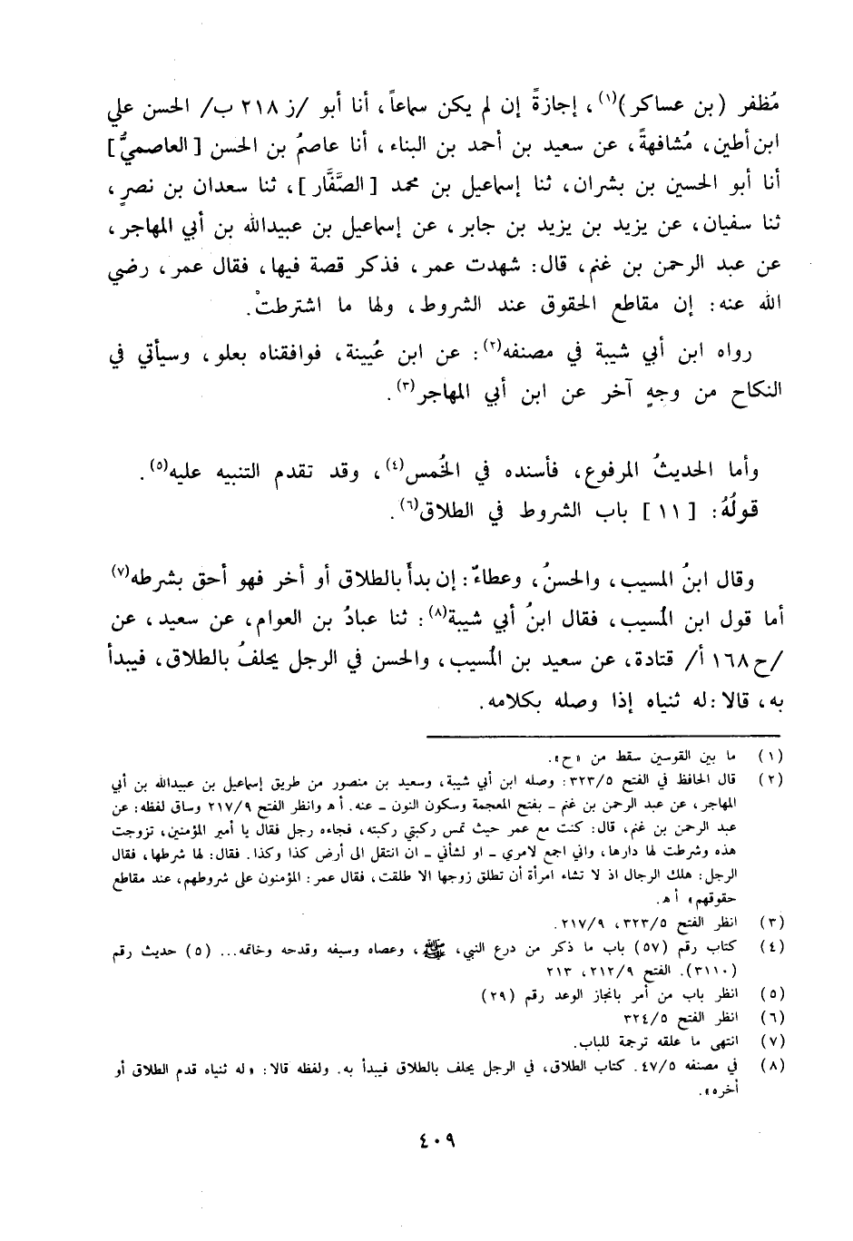 مظفر بن عَسَاكِر إجَازَة إِن لم يكن سَمَاعا أَنا أَبُو الْحسن عَليّ ابْن أَطْيَنَ مُشَافَهَةً عَنْ سَعِيدِ بْنِ أَحْمد بن الْبناء أَنا عَاصِم بْنُ الْحَسَنِ الْعَاصِمِيُّ أَنا أَبُو الْحُسَيْنِ بْنُ بِشْرَانِ ثَنَا إِسْمَاعِيلُ بن مُحَمَّد الصفار ثَنَا سَعْدَان بْنُ نَصْرٍ ثَنَا سُفْيَانُ عَنْ يَزِيدَ بْنِ يَزِيدَ بْنِ جَابِرٍ عَن إِسْمَاعِيل بن عبيد الله بْنِ أَبِي الْمُهَاجِرِ عَنْ عَبْدِ الرَّحْمَنِ بْنِ غَنْمٍ قَالَ شَهِدْتُ عُمَرَ فَذَكَرَ قِصَّةً فِيهَا فَقَالَ عُمَرُ رَضِيَ اللَّهُ عَنْهُ إِنَّ مَقَاطِعَ الْحُقُوقِ عِنْدَ الشُّرُوطِ وَلَهَا مَا اشْتَرَطْتَ