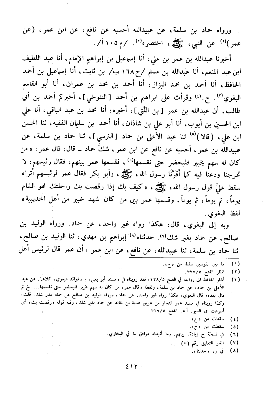 أَخْبَرَنَا عَبْدُ اللَّهِ بْنُ عُمَرَ بْنِ عَلِيٍّ أَنا إِسْمَاعِيلُ بْنُ إِبْرَاهِيمَ الإِمَامُ أَنا عَبْدُ اللَّطِيفِ بْنُ عَبْدِ الْمُنْعِمِ أَنا عَبْدُ اللَّهِ بْنُ مُسْلِمِ بْنِ ثَابِتٍ أَنا إِسْمَاعِيل ابْن أَحْمَدَ الْحَافِظُ أَنا أَحْمَدُ بْنُ مُحَمَّدٍ الْبَزَّازُ أَنا أَحْمَدُ بْنُ مُحَمَّدِ بْنِ عِمْرَانَ أَنا أَبُو الْقَاسِمِ الْبَغَوِيُّ ح وَقرأت عَلَى إِبْرَاهِيمَ بْنِ أَحْمَدَ التَّنُوخِيِّ أَخْبَرَكُمْ أَحْمد بن أبي طَالب أَن عبد الله بن عمر بن اللَّتِّيِّ أَخْبَرَهُ أَنا مُحَمَّدُ بْنُ عَبْدِ الْبَاقِي أَنا عَلِيُّ بْنُ الْحُسَيْنِ بْنِ أَيُّوبَ أَنا أَبُو عَلِيِّ بْنُ شَاذَانَ أَنا أَحْمَدُ بْنُ سُلَيْمَانَ الْفَقِيهُ ثَنَا الْحَسَنُ بْنُ عَلِيٍّ قَالا ثَنَا عَبْدُ الْأَعْلَى بن حَمَّاد النَّرْسِي ثَنَا حَمَّاد بن سَلمَة عَن عبيد الله بْنِ عُمَرَ أَحْسِبُهُ عَنْ نَافِعٍ عَنِ ابْنِ عُمَرَ شَكَّ حَمَّادٌ قَالَ قَالَ عُمَرُ مَنْ كَانَ لَهُ سَهْمٌ بِخَيْبَرَ فَلْيَحْضُرْ حَتَّى نُقَسِّمَهَا فَقَسَّمَهَا عُمَرُ بَيْنَهُمْ فَقَالَ رَئِيسُهُمْ لَا تُخْرِجْنَا وَدَعْنَا فِيهِ كَمَا أَقَرَّنَا رَسُولُ اللَّهِ صَلَّى اللَّهُ عَلَيْهِ وَسَلَّمَ وَأَبُو بَكْرٍ فَقَالَ عُمَرُ لِرَئِيسِهِمْ أَتَرَاهُ سَقَطَ عَلَيَّ قَوْلُ رَسُولِ اللَّهِ صَلَّى الله عَلَيْهِ وَسلم كَيفَ بك إِذَا رَقَصَتْ بِكَ رَاحِلَتُكَ نَحْوَ الشَّامِ يَوْمًا ثُمَّ يَوْمًا ثُمَّ يَوْمًا وَقَسَّمَهَا عُمَرُ بَيْنَ مَنْ كَانَ شَهِدَ خَيْبَرَ مِنْ أَهْلِ الْحُدَيْبِيَةِ لفظ الْبَغَوِيّ