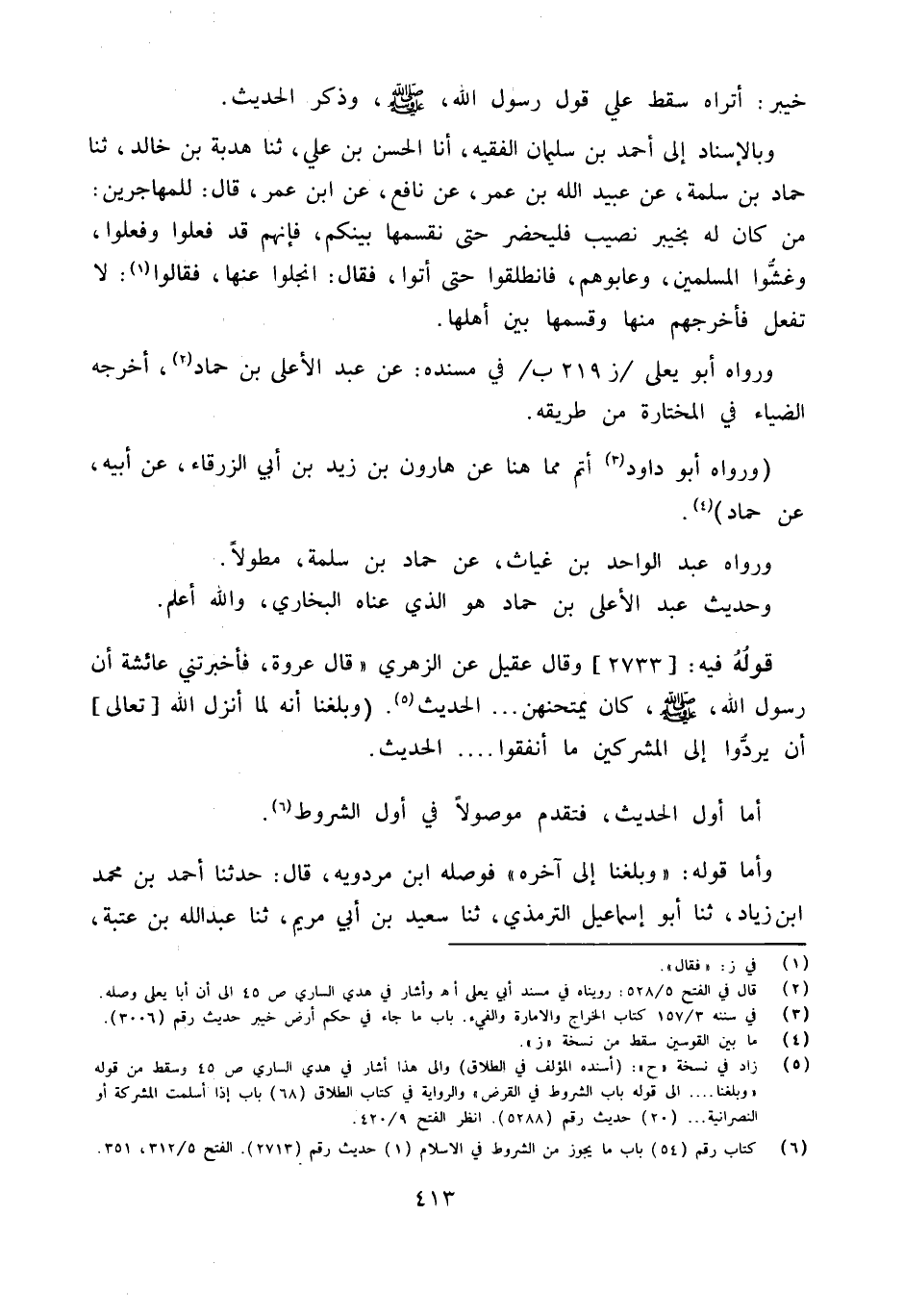 وَبِالإِسْنَادِ إِلَى أَحْمَدَ بْنِ سُلَيْمَانَ الْفَقِيهُ أَنا الْحَسَنُ بن عَليّ ثَنَا هدبة ابْن خَالِدٍ ثَنَا حَمَّادُ بْنُ سَلَمَةَ عَن عبيد الله بْنِ عُمَرَ عَنْ نَافِعٍ عَنِ ابْنِ عُمَرَ قَالَ لِلْمُهَاجِرِينَ مَنْ كَانَ لَهُ بِخَيْبَرَ نَصِيبٌ فَلْيَحْضُرْ حَتَّى نُقَسِّمَهَا بَيْنَكُمْ فَإِنَّهُمْ قَدْ فَعَلُوا وَفَعَلُوا وَغَشُّوا الْمُسْلِمِينَ وَعَابُوهُمْ فَانْطَلَقُوا حَتَّى أَتَوْا فَقَالَ انْجَلُوا عَنْهَا فَقَالُوا لَا تَفْعَلُ فَأَخْرَجَهُمْ مِنْهَا وَقَسَّمَهَا بَيْنَ أَهْلِهَا