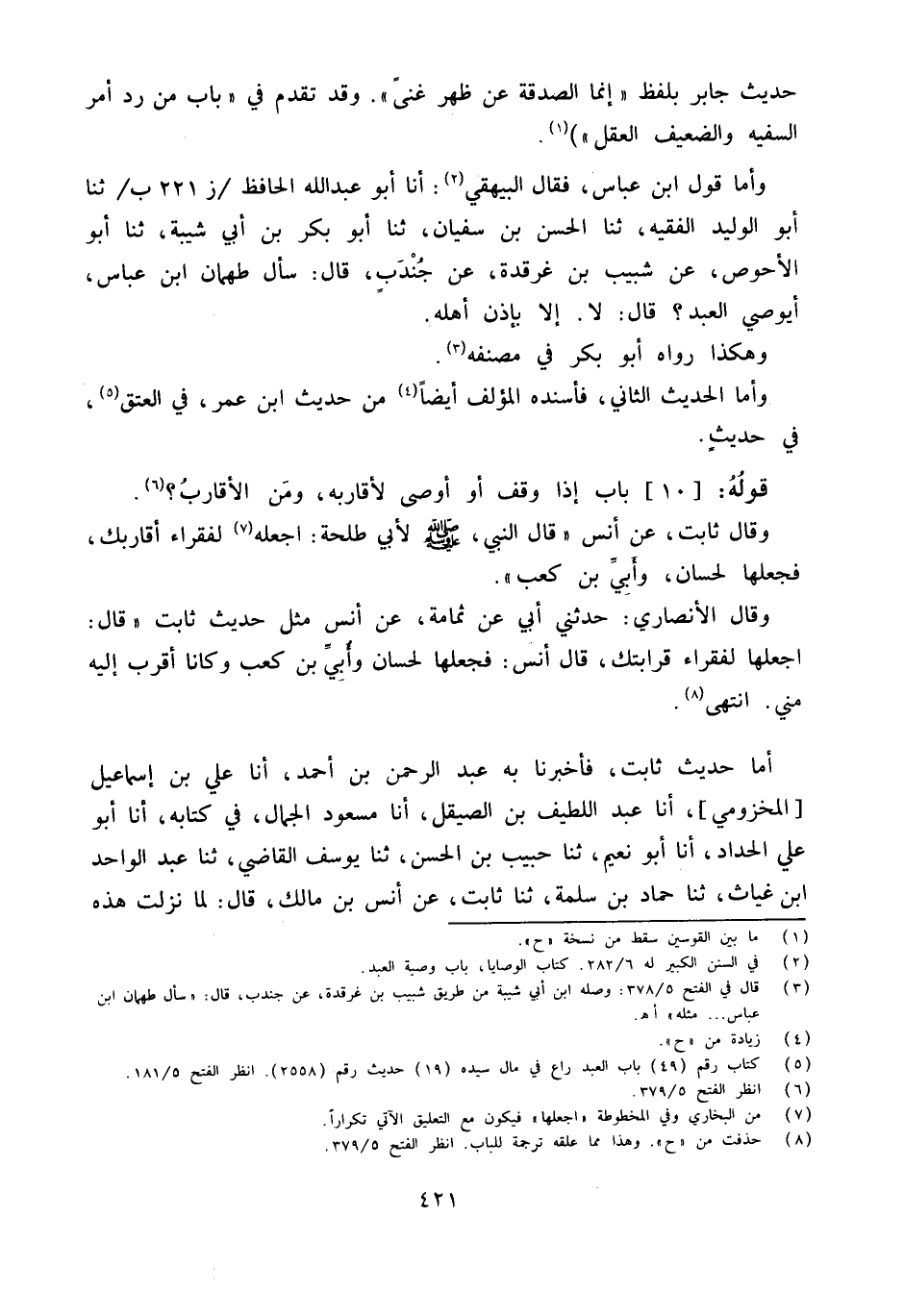 وَأما قَول ابْن عَبَّاس فَقَالَ الْبَيْهَقِيّ أَنا أَبُو عَبْدِ اللَّهِ الْحَافِظُ ثَنَا أَبُو الْوَلِيدِ الْفَقِيهُ ثَنَا الْحَسَنُ بْنُ سُفْيَانَ ثَنَا أَبُو بَكْرٍ بن أبي شيبَة ثَنَا أَبُو الأَحْوَصِ عَنْ شَبِيبِ بْنِ غَرْقَدَةَ عَنْ جُنْدُبٍ قَالَ سَأَلَ طَهْمَانُ ابْنَ عَبَّاسٍ أَيُوصِي الْعَبْدُ قَالَ لَا إِلا بِإِذْنِ أَهْلِهِ