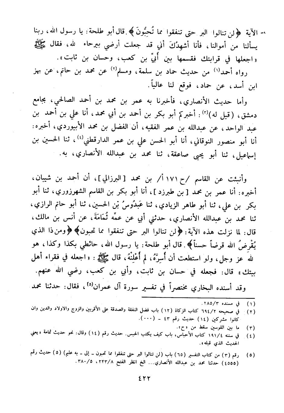 وَأُنْبِئْتُ عَنِ الْقَاسِمِ بْنِ مُحَمَّدٍ الْبِرْزَالِيِّ أَنَّ أَحْمد بن شَيبَان أخبرهُ أَنا عمر بن مُحَمَّد بن طبرزد أَنا أَبُو بَكْرٍ الْقَاسِمُ الشَّهْرُزُورِيُّ ثَنَا أَبُو بكر ابْن عَلِيٍّ ثَنَا أَبُو طَاهِرٍ الزِّيَادِيُّ ثَنَا عَبْدُوسُ بْنُ الْحُسَيْنِ ثَنَا أَبُو حَاتِمٍ الرَّازِيُّ ثَنَا مُحَمَّدُ بْنُ عَبْدِ اللَّهِ الأَنْصَارِيُّ حَدَّثَنِي أَبِي عَنْ عَمِّهِ ثُمَامَةَ عَنْ أَنَسِ بْنِ مَالِكٍ قَالَ لَمَّا نَزَلَتْ هَذِهِ الآيَةُ {لَنْ تَنَالُوا الْبِرَّ حَتَّى تُنْفِقُوا مِمَّا تُحِبُّونَ} {مَنْ ذَا الَّذِي يُقْرِضُ اللَّهَ قرضا حسنا} قَالَ أَبُو طَلْحَةَ يَا رَسُولَ اللَّهِ حَائِطِي بِكَذَا وَكَذَا هُوَ لله عز وَحل وَلَوِ اسْتَطَعْتُ أَنْ أُسِرَّهُ لَمْ أعلنه قَالَ صَلَّى اللَّهُ عَلَيْهِ وَسَلَّمَ اجْعَلْهُ فِي فُقَرَاءِ أَهْلِ بَيْتِكَ قَالَ فَجعله فِي حسان بن ثَابت وَأبي بن كَعْب رَضِي الله عَنْهُم