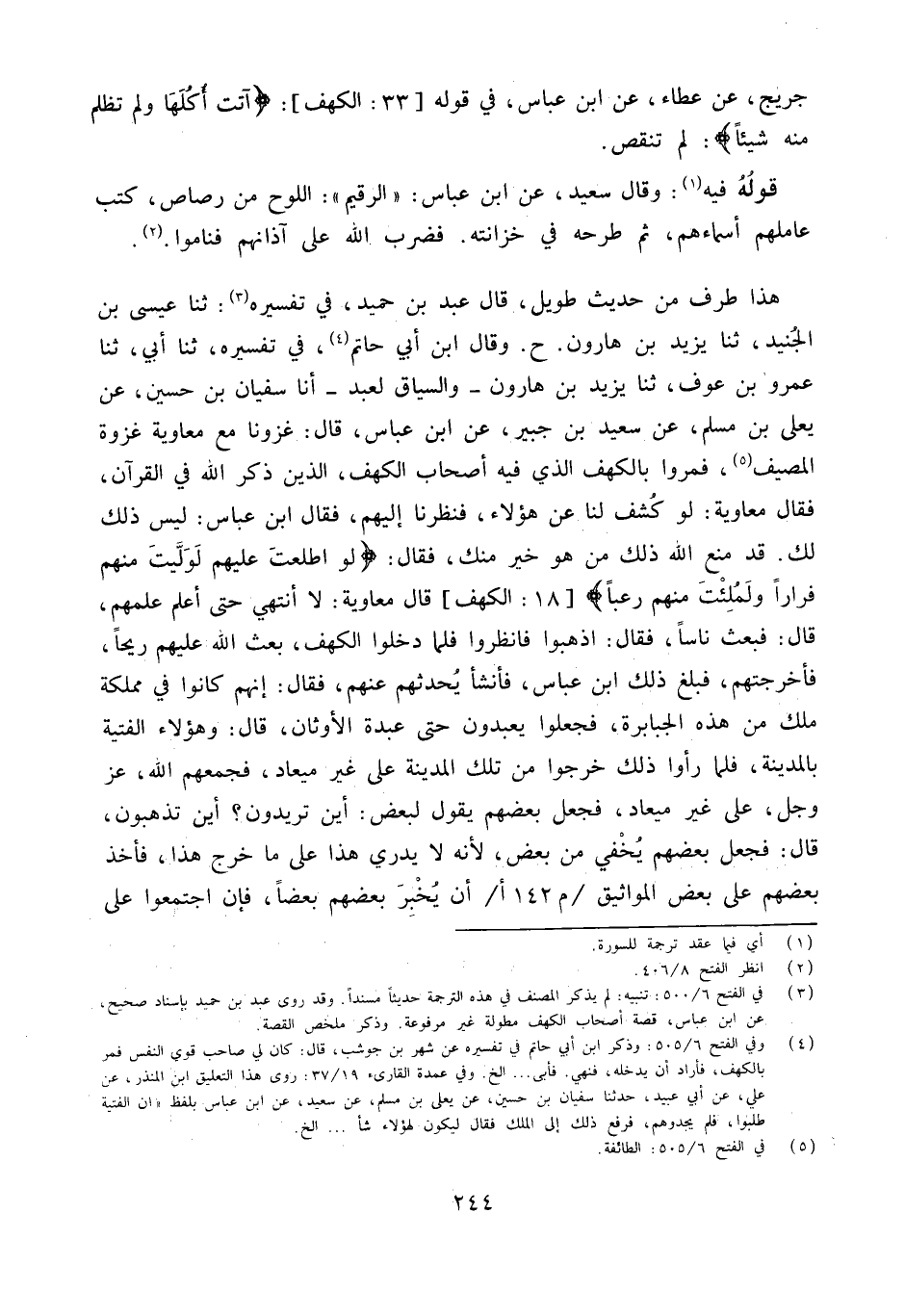 هَذَا طرف من حَدِيث طَوِيل قَالَ عبد بن حميد فِي تَفْسِيرِهِ ثَنَا عِيسَى بْنُ الْجُنَيْدِ ثَنَا يَزِيدُ بْنُ هَارُونَ ح وَقَالَ لِابْنِ أَبِي حَاتِمٍ فِي تَفْسِيرِهِ ثَنَا أَبِي ثَنَا عَمْرُو بْنُ عَوْفٍ ثَنَا يَزِيدُ بْنُ هَارُونَ وَالسِّيَاقُ لِعَبْدٍ أَنا سُفْيَانُ بْنُ حُسَيْنٍ عَنْ يَعْلَى بْنِ مُسْلِمٍ عَنْ سَعِيدِ بْنِ جُبَيْرٍ عَنِ ابْنِ عَبَّاسٍ قَالَ غَزَوْنَا مَعَ مُعَاوِيَةَ غَزْوَةَ الْمَصِيفِ فَمَرُّوا بِالْكَهْفِ الَّذِي فِيهِ أَصْحَابُ الْكَهْفِ الَّذِينَ ذَكَرَ اللَّهُ فِي الْقُرْآنِ فَقَالَ مُعَاوِيَةُ لَوْ كُشِفَ لَنَا عَنْ هَؤُلاءِ فَنَظَرْنَا إِلَيْهِمْ فَقَالَ ابْنُ عَبَّاسٍ لَيْسَ ذَلِكَ لَكَ قَدْ مَنَعَ اللَّهُ ذَلِكَ مَنْ هُوَ خَيْرٌ مِنْكَ فَقَالَ {لَوِ اطَّلَعْتَ عَلَيْهِمْ لَوَلَّيْتَ مِنْهُمْ فِرَارًا وَلَمُلِئْتَ مِنْهُمْ رُعْبًا} 18 الْكَهْف قَالَ مُعَاوِيَةُ لَا أَنْتَهِي حَتَّى أَعْلَمَ عِلْمَهُمْ قَالَ فَبَعَثَ نَاسًا فَقَالَ اذْهَبُوا فَانْظُرُوا فَلَمَّا دَخَلُوا الْكَهْفَ بَعَثَ اللَّهُ عَلَيْهِمْ رِيحًا فَأَخْرَجَتْهُمْ فَبَلَغَ ذَلِكَ ابْنَ عَبَّاسٍ فَأَنْشَأَ يُحَدِّثُهُمْ عَنْهُمْ فَقَالَ إِنَّهُمْ كَانُوا فِي مَمْلَكَةِ مَلِكٍ مِنْ هَذِهِ الْجَبَابِرَةِ فَجَعَلُوا يَعْبُدُونَ حَتَّى عَبَدَةِ الأَوْثَانِ قَالَ وَهَؤُلاءِ الْفِتْيَةُ بِالْمَدِينَةِ فَلَمَّا رَأَوْا ذَلِكَ خَرَجُوا مِنْ تِلْكَ الْمَدِينَةِ عَلَى غَيْرِ مِيعَادٍ فَجَمَعَهُمُ اللَّهُ عَزَّ وَجَلَّ عَلَى غَيْرِ مِيعَادٍ فَجَعَلَ بَعْضُهُمْ يَقُولُ لِبَعْضٍ أَيْنَ تُرِيدُونَ أَيْنَ تَذْهَبُونَ قَالَ فَجَعَلَ بَعْضُهُمْ يُخْفِي مِنْ بَعْضٍ لأَنَّهُ لَا يَدْرِي هَذَا عَلَى مَا خَرَجَ هَذَا فَأَخَذَ بَعْضُهُمْ عَلَى بعض المواثيق م 142 أَنْ يُخْبِرَ بَعْضُهُمْ بَعْضًا فَإِنِ اجْتَمعُوا على