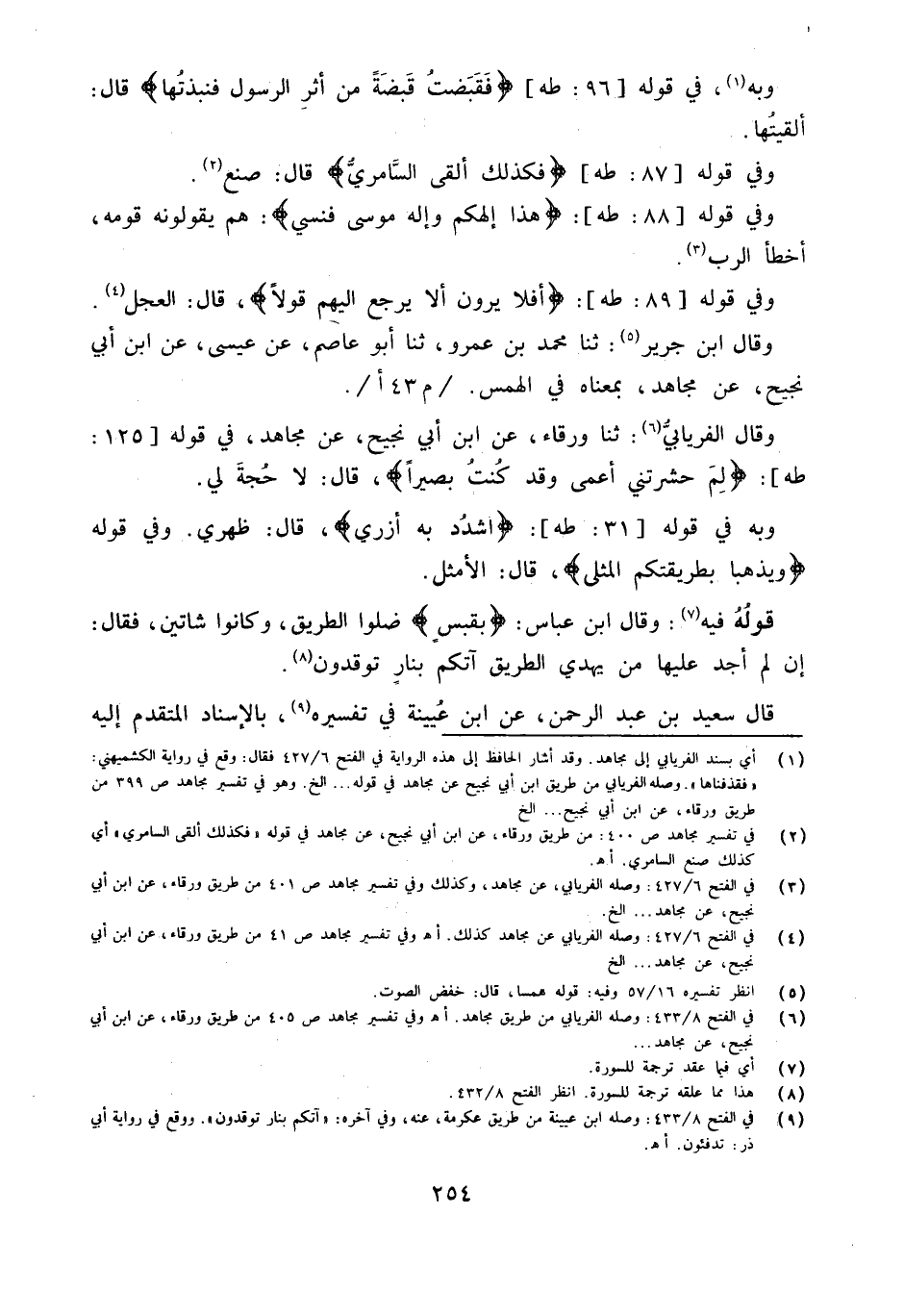وَقَالَ الْفرْيَابِيّ ثَنَا وَرْقَاء عَن ابْن أبي نجيح عَن مُجَاهِد فِي قَوْله 125 طه {لِمَ حَشَرْتَنِي أَعْمَى وَقَدْ كُنْتُ بَصيرًا} قَالَ لَا حجَّة لي