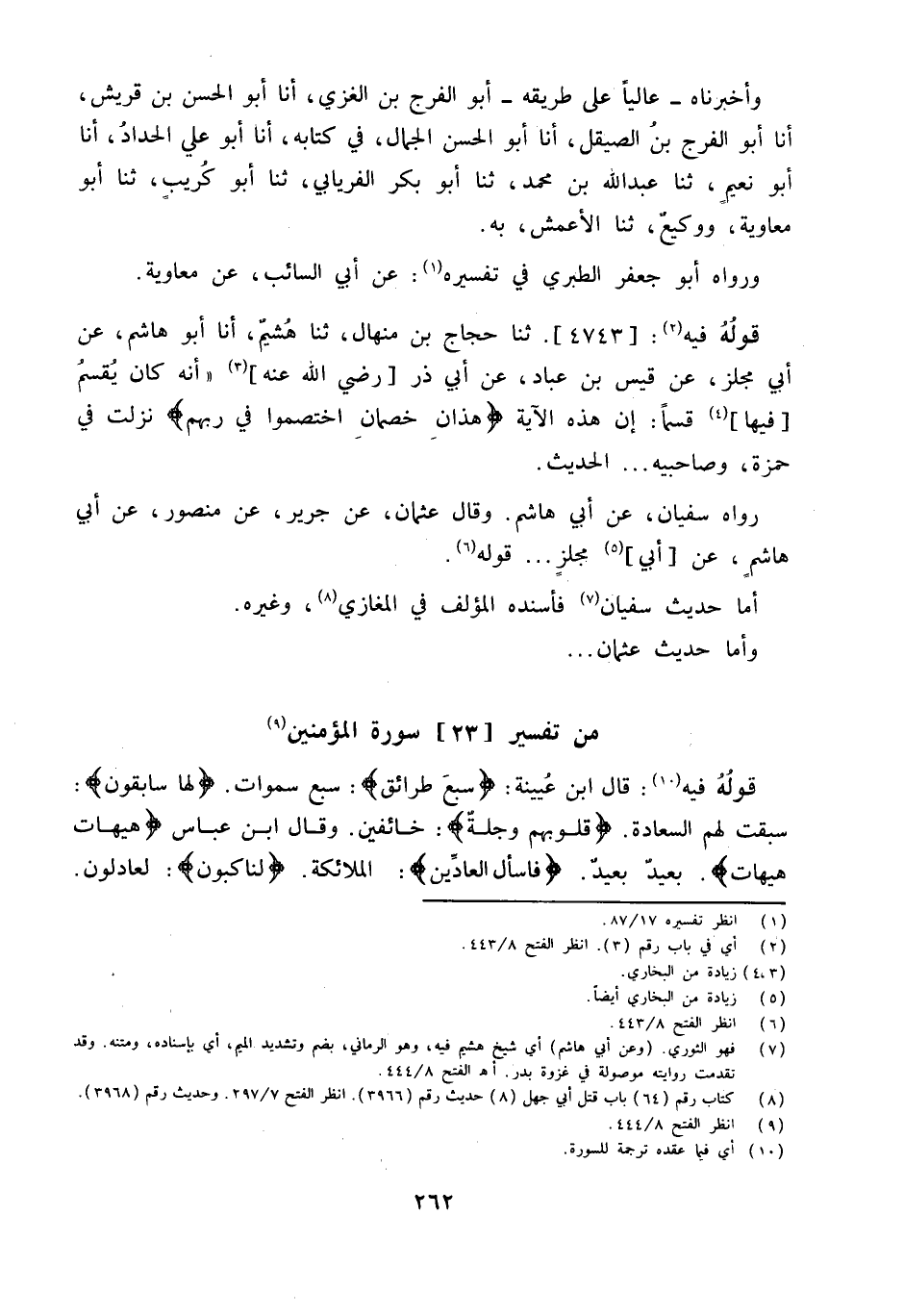 قَالَ ابْن عُيَيْنَة {سبع طرائق} سبع سموات {لَهَا سَابِقُونَ} سبقت لَهُم السَّعَادَة {وَقُلُوبُهُمْ وَجِلَةٌ} خَائِفين وَقَالَ ابْن عَبَّاس {هَيْهَاتَ هَيْهَات} بعيد بعيد {فاسأل العادين} الْمَلَائِكَة {لناكبون} لعادلون
