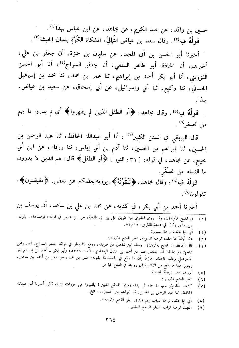 قَالَ الْبَيْهَقِيّ فِي السّنَن الْكَبِير أَنا أَبُو عبد الله الْحَافِظ ثَنَا عبد الرَّحْمَن بن الْحُسَيْن ثَنَا إِبْرَاهِيم بن الْحُسَيْن ثَنَا آدم بن أبي إِيَاس ثَنَا وَرْقَاء عَن ابْن أبي نجيح عَن مُجَاهِد فِي قَوْله 31 النُّور {أَو الطِّفْل} قَالَ هم الَّذين لَا يَدْرُونَ مَا النِّسَاء من الصغر