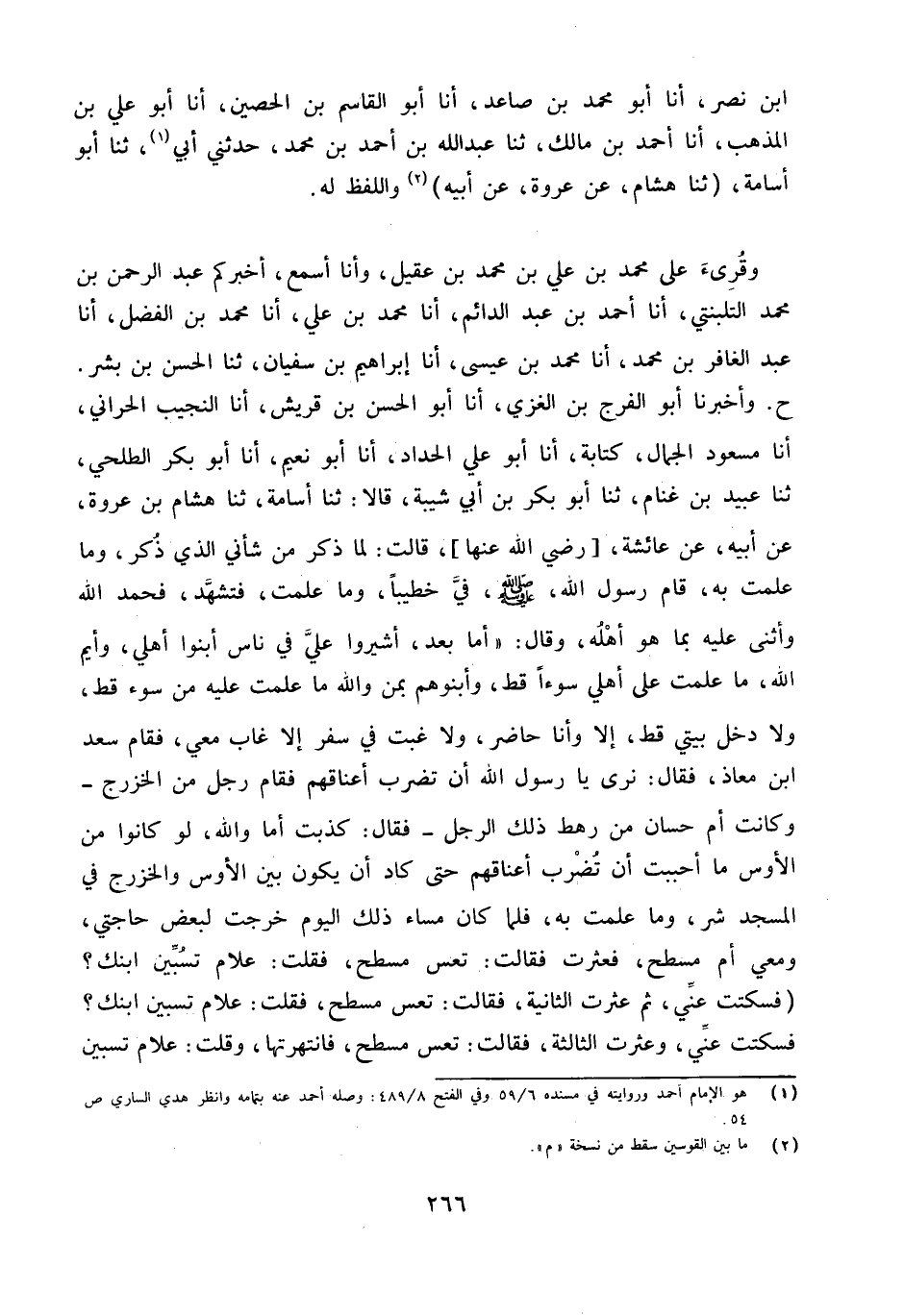 وَقُرِئَ عَلَى مُحَمَّدِ بْنِ عَلِيِّ بْنِ مُحَمَّدِ بْنِ عُقَيْلٍ وَأَنَا أَسْمَعُ أَخْبَرَكُمْ عَبْدُ الرَّحْمَنِ بْنُ مُحَمَّدٍ التلبنتي أَنا أَحْمَدُ بْنُ عَبْدِ الدَّائِمِ أَنا مُحَمَّدُ بْنُ عَلِيٍّ أَنا مُحَمَّدُ بْنُ الْفَضْلِ أَنا عَبْدُ الْغَافِرِ بْنُ مُحَمَّدٍ أَنا مُحَمَّدُ بْنُ عِيسَى أَنا إِبْرَاهِيمُ بْنُ سُفْيَانَ ثَنَا الْحَسَنُ بْنُ بِشْرٍ ح وَأَخْبَرَنَا أَبُو الْفَرَجِ بْنُ الْغَزِّيُّ أَنا أَبُو الْحَسَنِ بْنُ قُرَيْشٍ أَنَا النَّجِيبُ الْحَرَّانِيُّ أَنا مَسْعُودٌ الْجَمَّالُ كِتَابَةً أَنا أَبُو عَليّ الْحداد أَنا أَبُو نُعَيْمٍ أَنا أَبُو بَكْرٍ الطلحي ثَنَا عبيد بن غَنَّام ثَنَا أَبُو بكر بن أبي شَيْبَةَ قَالا ثَنَا أُسَامَةُ ثَنَا هِشَامِ بْنِ عُرْوَةَ عَنْ أَبِيهِ عَن عَائِشَة رَضِي الله عَنْهَا قَالَتْ لَمَا ذُكِرَ مِنْ شَأْنِي الَّذِي ذُكِرَ وَمَا عَلِمْتُ بِهِ قَامَ رَسُول الله صلى الله عَلَيْهِ وَسَلَّمَ فِيَّ خَطِيبًا وَمَا عَلِمْتُ فَتَشَهَّدَ فَحَمِدَ اللَّهَ وَأَثْنَى عَلَيْهِ بِمَا هُوَ أَهْلُهُ وَقَالَ أَمَّا بَعْدُ أَشِيرُوا عَلَيَّ فِي نَاسٍ أَبَنُوا أَهْلِي وَايْمُ اللَّهِ مَا عَلِمْتُ عَلَى أَهْلِي سُوءًا قَطُّ وَأَبَنُوهُمْ بِمَنْ وَاللَّهِ مَا عَلِمْتُ عَلَيْهِ مِنْ سُوءٍ قَطُّ وَلا دَخَلَ بَيْتِي قَطُّ إِلا وَأَنَا حَاضِرٌ وَلا غِبْتُ فِي سَفَرٍ إِلا غَابَ مَعِي فَقَامَ سعد ابْن مُعَاذٍ فَقَالَ نَرَى يَا رَسُولَ اللَّهِ أَنْ تَضْرِبَ أَعْنَاقَهُمْ فَقَامَ رَجُلٌ مِنَ الْخَزْرَجِ وَكَانَتْ أُمُّ حَسَّانٍ مِنْ رَهْطِ ذَلِكَ الرَّجُلِ فَقَالَ كَذَبْتَ أَمَا وَاللَّهِ لَوْ كَانُوا مِنَ الأَوْسِ مَا أَحْبَبْتَ أَنْ تُضْرَبَ أَعْنَاقُهُمْ حَتَّى كَادَ أَنْ يَكُونَ بَيْنَ الأَوْسِ وَالْخَزْرَجِ فِي الْمَسْجِدِ شَرٌّ وَمَا عَلِمْتُ بِهِ فَلَمَّا كَانَ مَسَاءُ ذَلِكَ الْيَوْمِ خَرَجْتُ لِبَعْضِ حَاجَتِي وَمَعِي أُمُّ مِسْطَحٍ فَعَثَرَتْ فَقَالَتْ تَعِسَ مِسْطَحٌ فَقُلْتُ عَلامَ تَسُبِّينَ ابْنَكِ فَسَكَتَتْ عَنِّي ثُمَّ عَثَرَتِ الثَّانِيَةَ فَقَالَتْ تَعِسَ مِسْطَحٌ فَقُلْتُ عَلامَ تَسُبِّينَ ابْنَكِ فَسَكَتَتْ عَنِّي وَعَثَرَتِ الثَّالِثَة فَقلت تَعِسَ مِسْطَحٌ فَانْتَهَرْتُهَا وَقُلْتُ عَلامَ تسبين