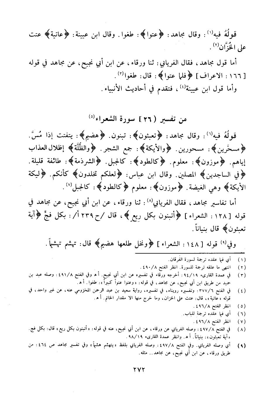 أما تفاسير مُجَاهِد فَقَالَ الْفرْيَابِيّ ثَنَا وَرْقَاء عَن ابْن أبي نجيح عَن مُجَاهِد فِي قَوْله 128 الشُّعَرَاء {أتبنون بِكُل ريع} قَالَ ح 239 بِكُل فج {آيَة تعبثون} قَالَ بنيانا