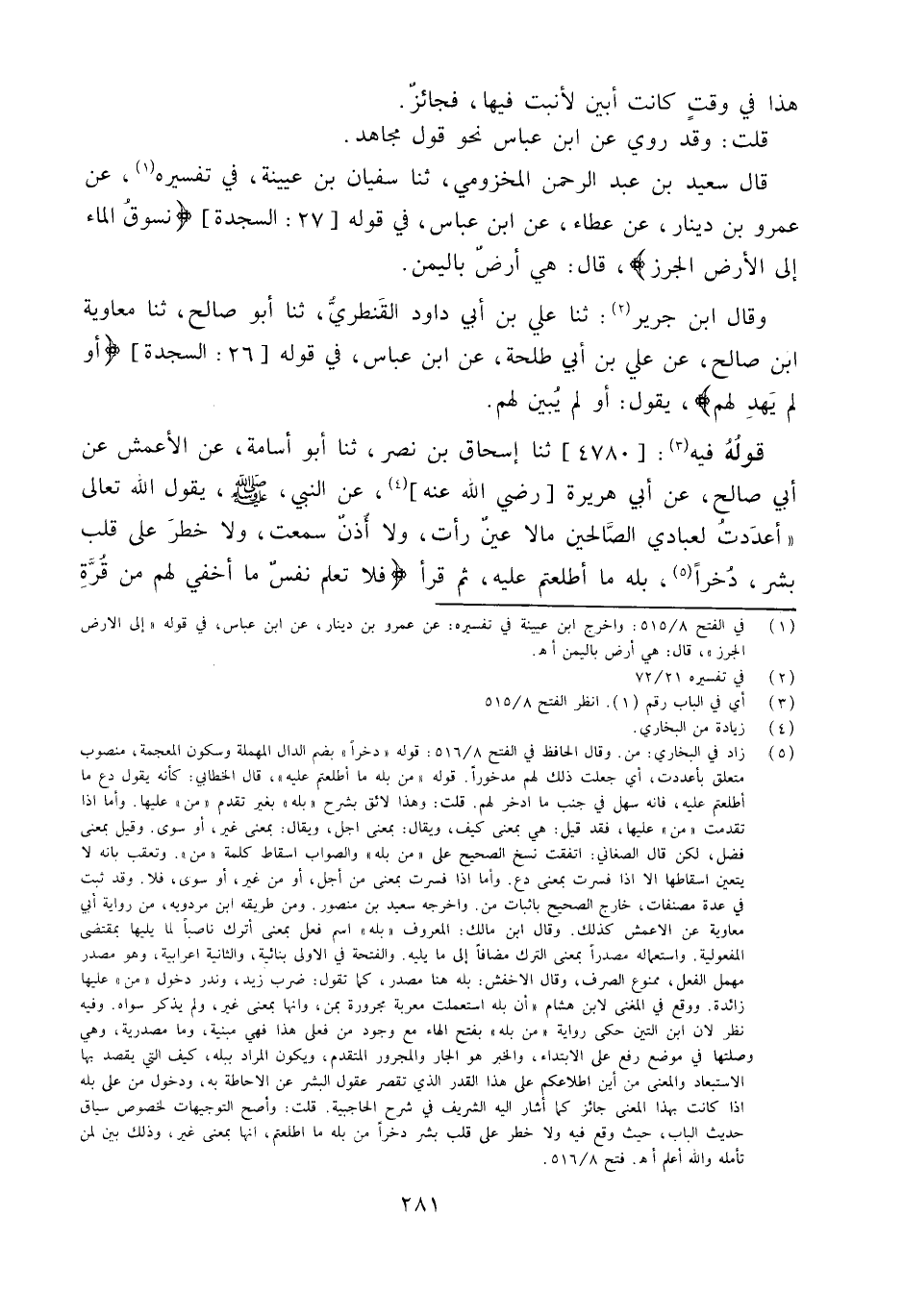 قَالَ سَعِيدُ بْنُ عَبْدِ الرَّحْمَن المَخْزُومِي ثَنَا سُفْيَان بن عُيَيْنَة فِي تَفْسِيره عَن عَمْرو بْنِ دِينَارٍ عَنْ عَطَاءٍ عَنِ ابْن عَبَّاس فِي قَوْله 27 السَّجْدَة {نَسُوقُ الْمَاءَ إِلَى الأَرْضِ الْجُرُزِ} قَالَ هِيَ أَرْضٌ بِالْيَمَنِ