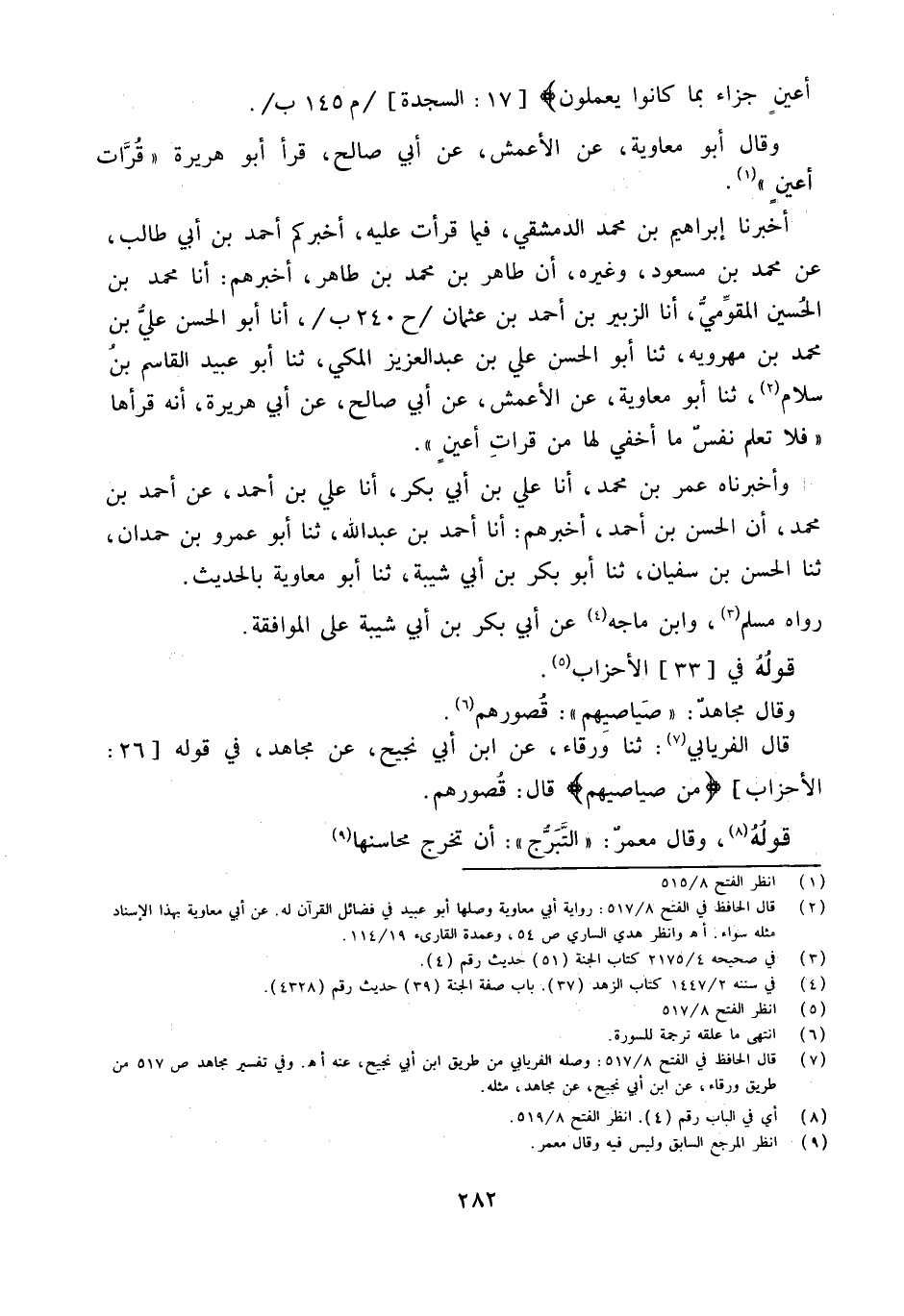أَخْبَرَنَا إِبْرَاهِيمُ بْنُ مُحَمَّدٍ الدِّمَشْقِيُّ فِيمَا قَرَأْتُ عَلَيْهِ أَخْبَرَكُمْ أَحْمَدُ بْنُ أَبِي طَالِبٍ عَنْ مُحَمَّدِ بْنِ مَسْعُودٍ وَغَيْرِهِ أَنَّ طَاهِرَ بْنَ مُحَمَّدِ بْنِ طَاهِرٍ أَخْبَرَهُمْ أَنا مُحَمَّدُ بْنُ الْحُسَيْنِ الْمُقَوَّمِيُّ أَنا الزُّبَيْرُ بن أَحْمد بن عُثْمَان ح 240 ب أَنا أَبُو الْحسن عَليّ بن مُحَمَّدِ بْنِ مَهْرَوَيْهِ ثَنَا أَبُو الْحَسَنِ عَلِيُّ بْنُ عَبْدِ الْعَزِيزِ الْمَكِّيُّ ثَنَا أَبُو عُبَيْدٍ الْقَاسِمُ بْنُ سَلامٍ ثَنَا أَبُو مُعَاوِيَةَ عَنِ الأَعْمَشِ عَنْ أَبِي صَالِحٍ عَنْ أَبِي هُرَيْرَةَ أَنَّهُ قَرَأَهَا فَلا تَعْلَمُ نَفْسٌ مَا أُخْفِيَ لَهَا مِنْ قُرَّاتِ أَعْيُنٍ